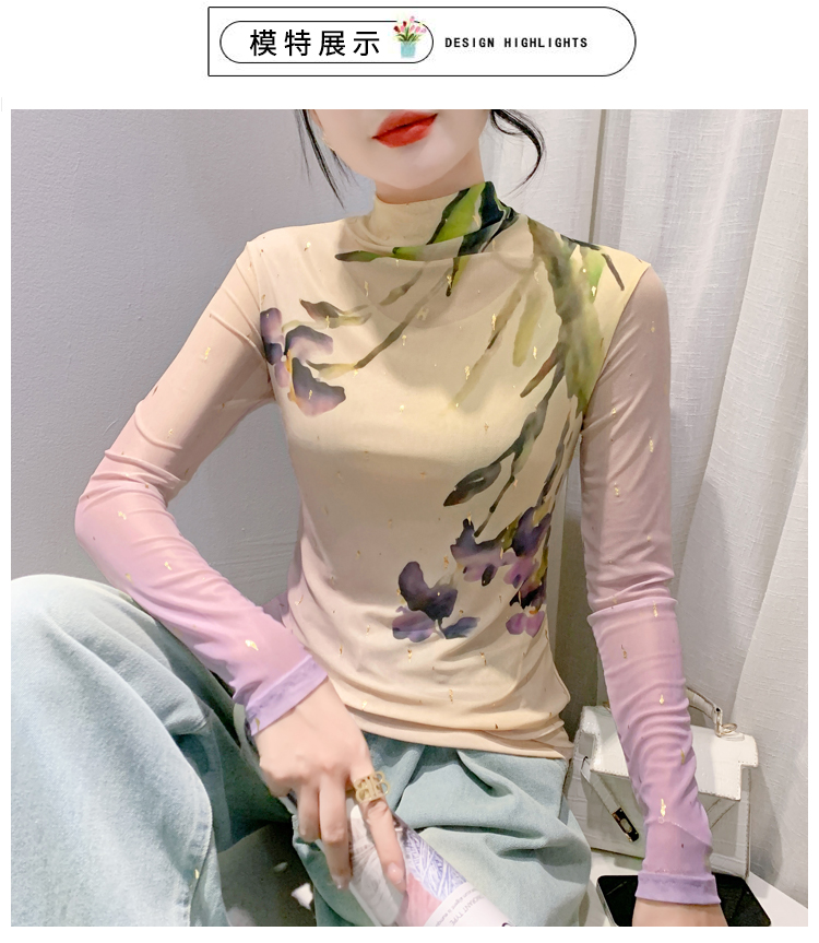 RM23775#欧货女装2023秋冬时尚洋气长袖高领网纱t恤女烫金定位花上衣