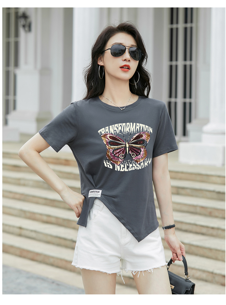 RM23836#纯棉正肩短袖t恤女夏季2023年新款不规则设计感印花显瘦上衣休闲