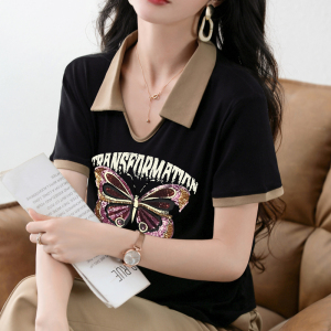 RM23838#纯棉正肩短袖t恤女夏季2023年新款设计感印花显瘦别致V领休闲上衣