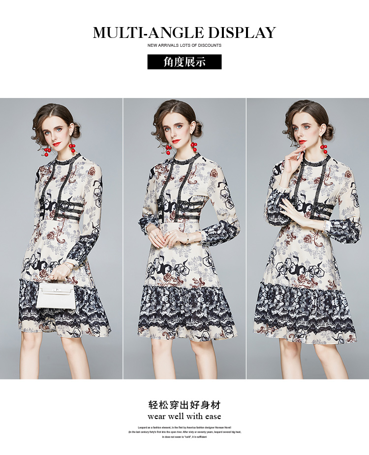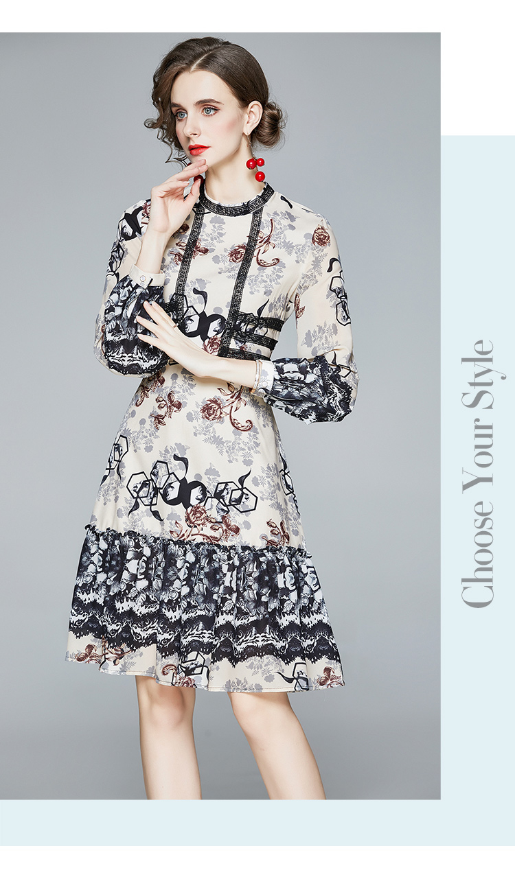 RM24030#秋季女装立领长袖收腰显瘦时尚印花雪纺连衣裙