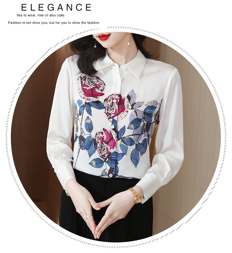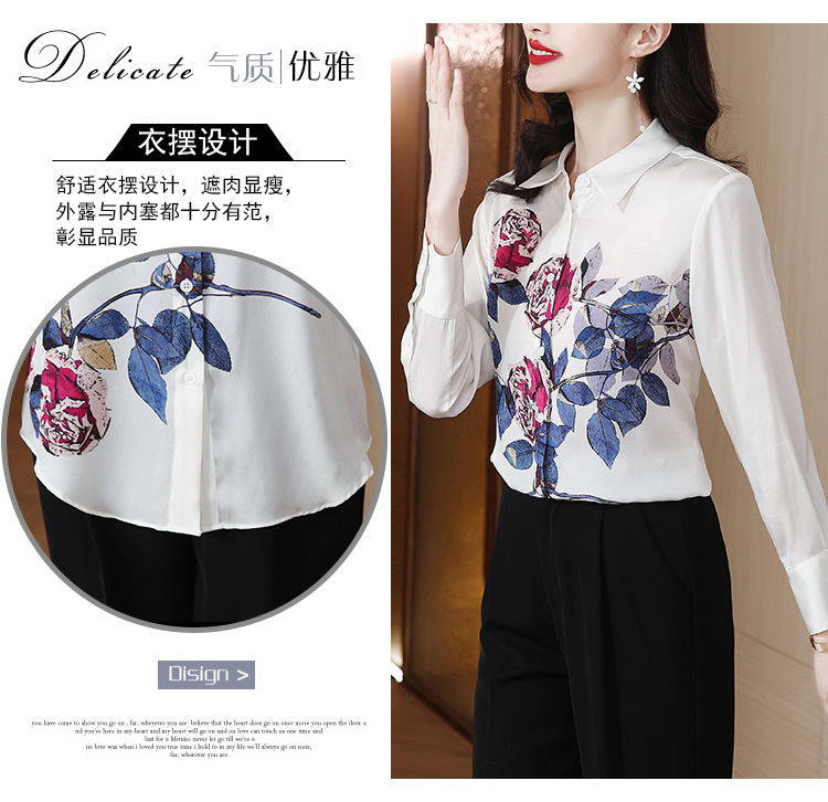 RM24110# 高雅玫瑰定位印花翻领长袖重磅真丝衬衫桑蚕丝上衣23女