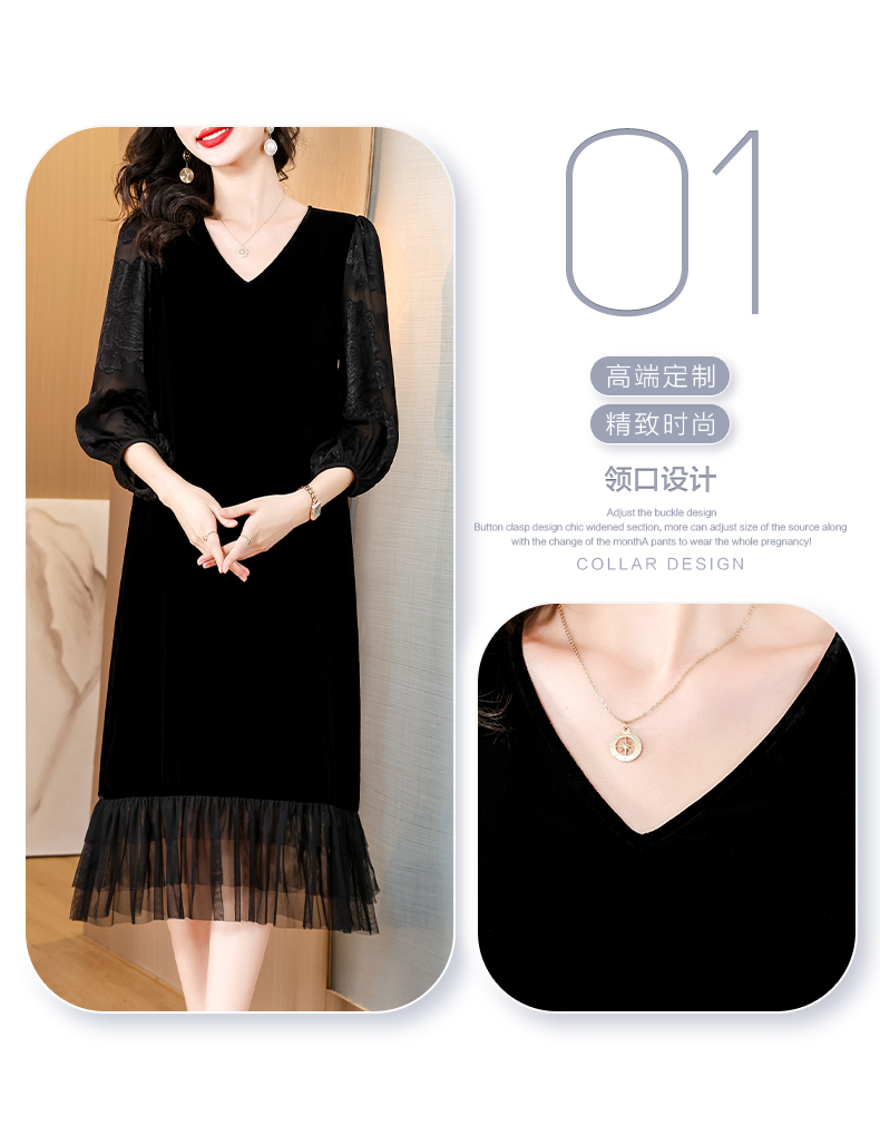 RM24131#新款丝绒连衣裙秋黑色V领下摆拼接网纱宽松显瘦时尚洋气长裙
