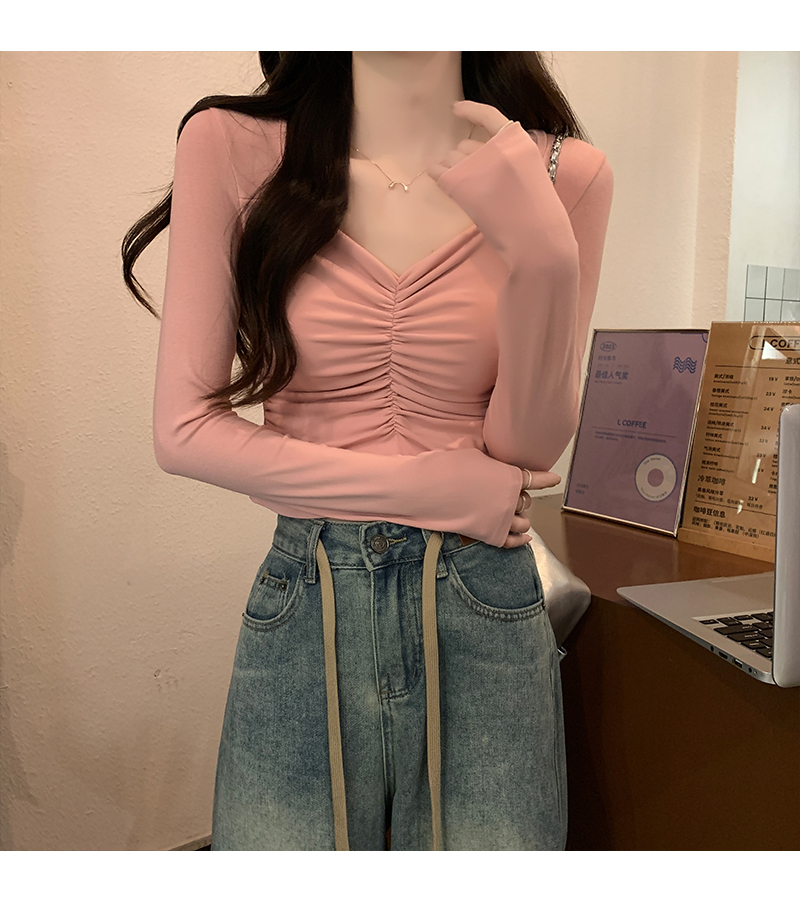 RM24180#辣妹v领长袖t恤女秋装新款小心机设计感露锁骨修身显瘦内搭打底衫