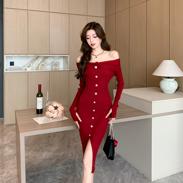 RM24234#性感打底裙一字领露肩设计单排扣针织连衣裙