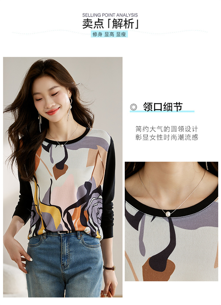 RM24294#新款针织女长袖2023早秋高端缎面印花套头毛衣休闲圆领上衣