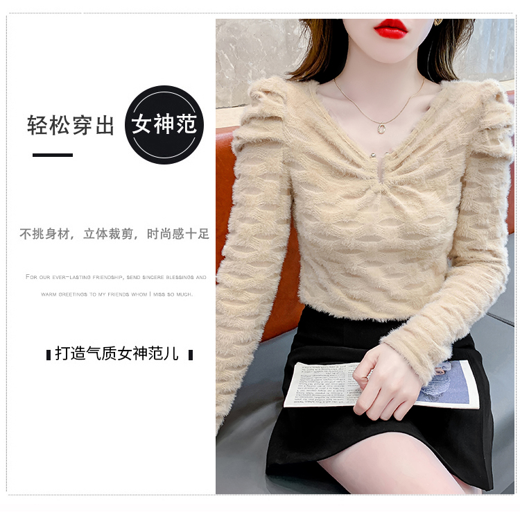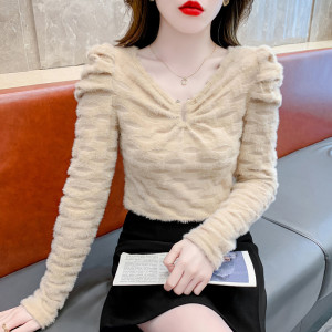 RM24425#新款水貂毛蕾丝打底衫女小心机V领时尚泡泡袖上衣高级感
