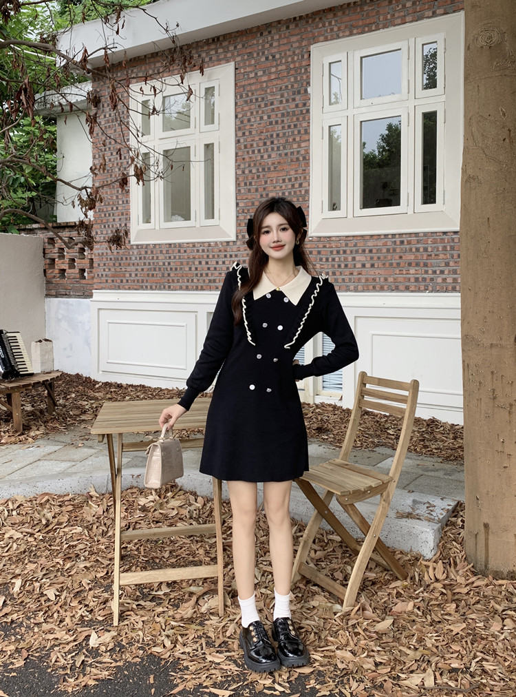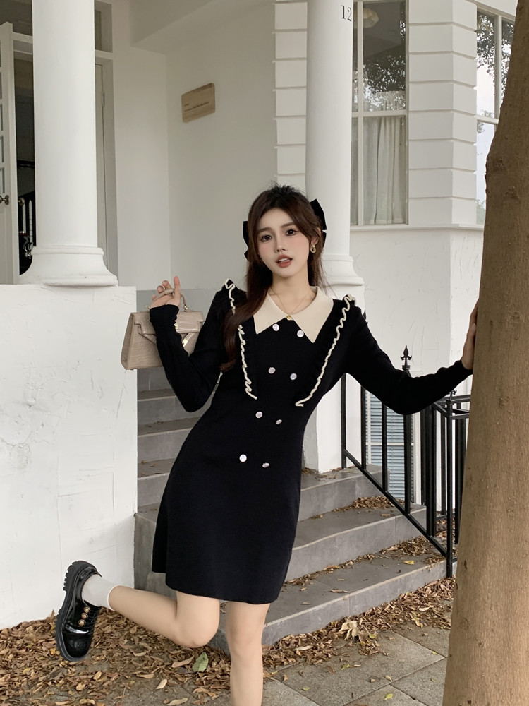 RM24460#大码女装秋冬法式木耳边双排扣小黑裙胖MM气质显瘦针织连衣裙