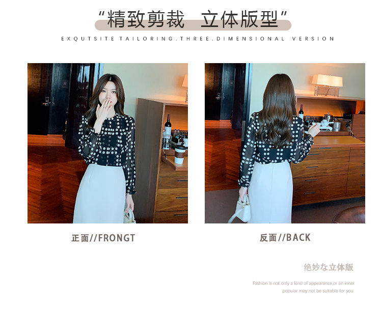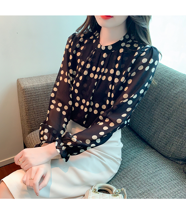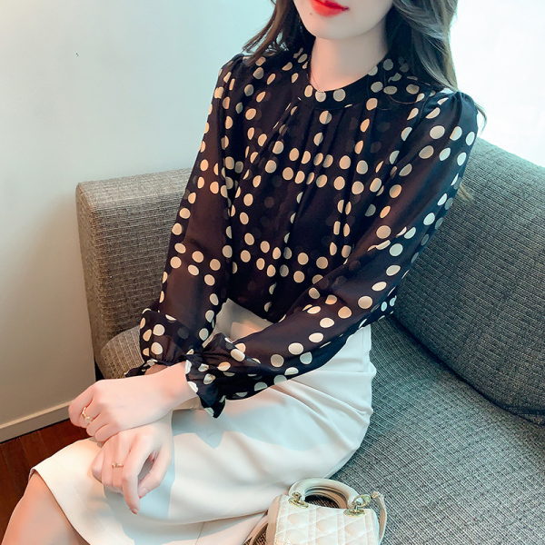 RM25134#法式波点衬衫女2023秋季新款圆领荷叶边长袖雪纺衫上衣