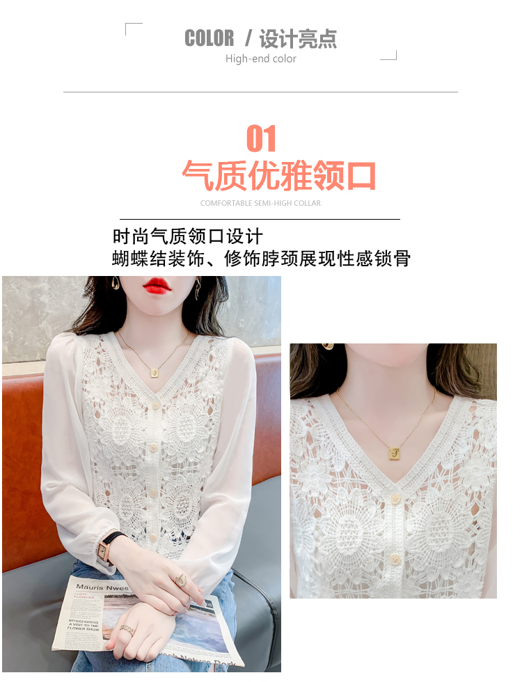 RM25292#法式复古设计感拼接瑞丽镂空钩花v领小众雪纺泡泡袖针织衫女