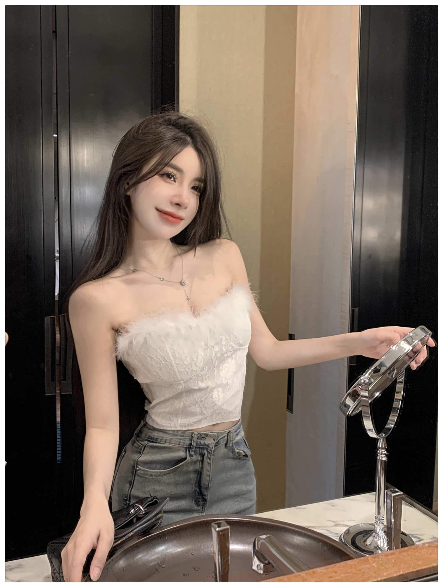 RM25423#纯欲性感法式黑色抹胸背心鸵鸟毛一字领辣妹内搭短款上衣女