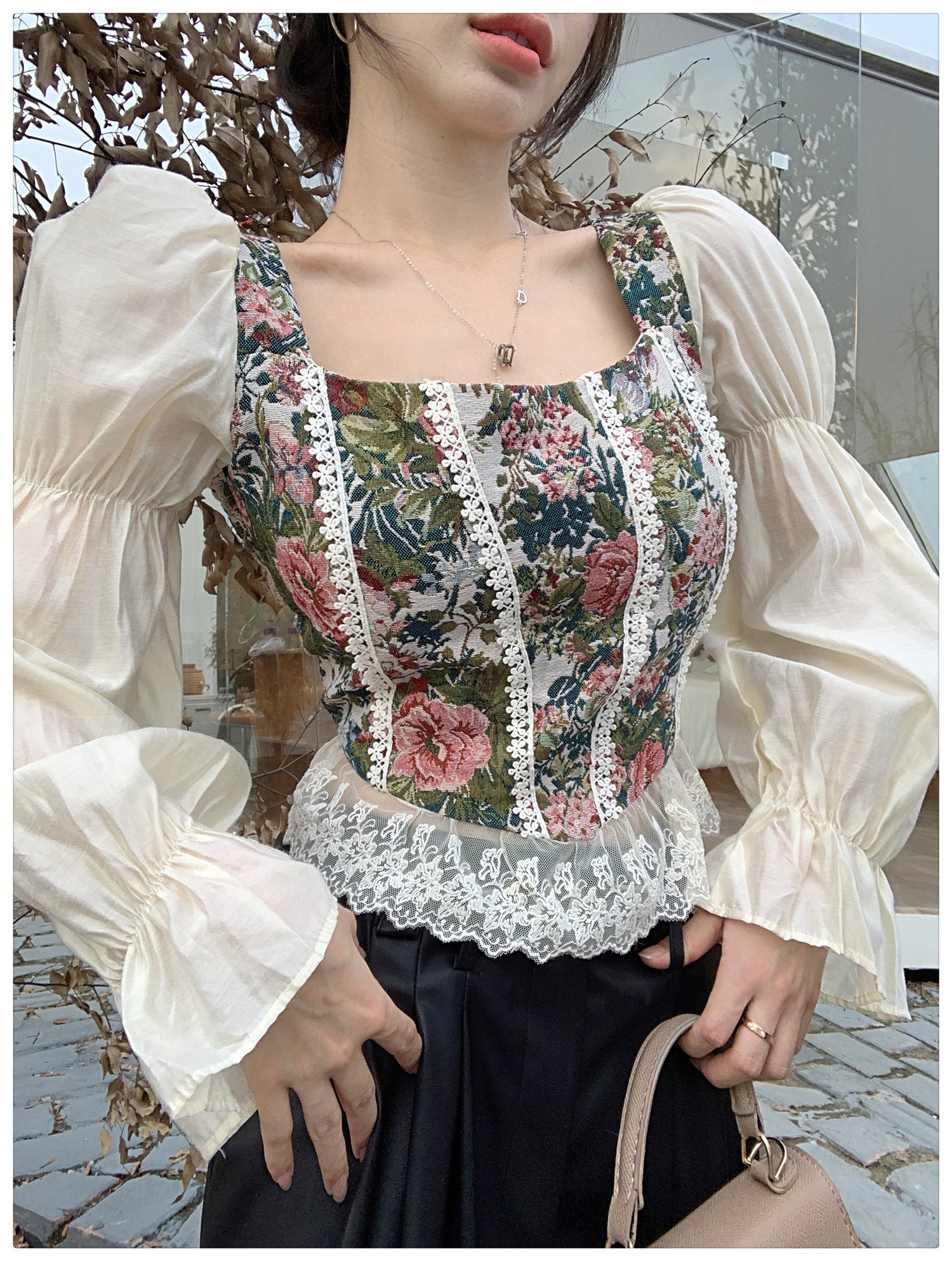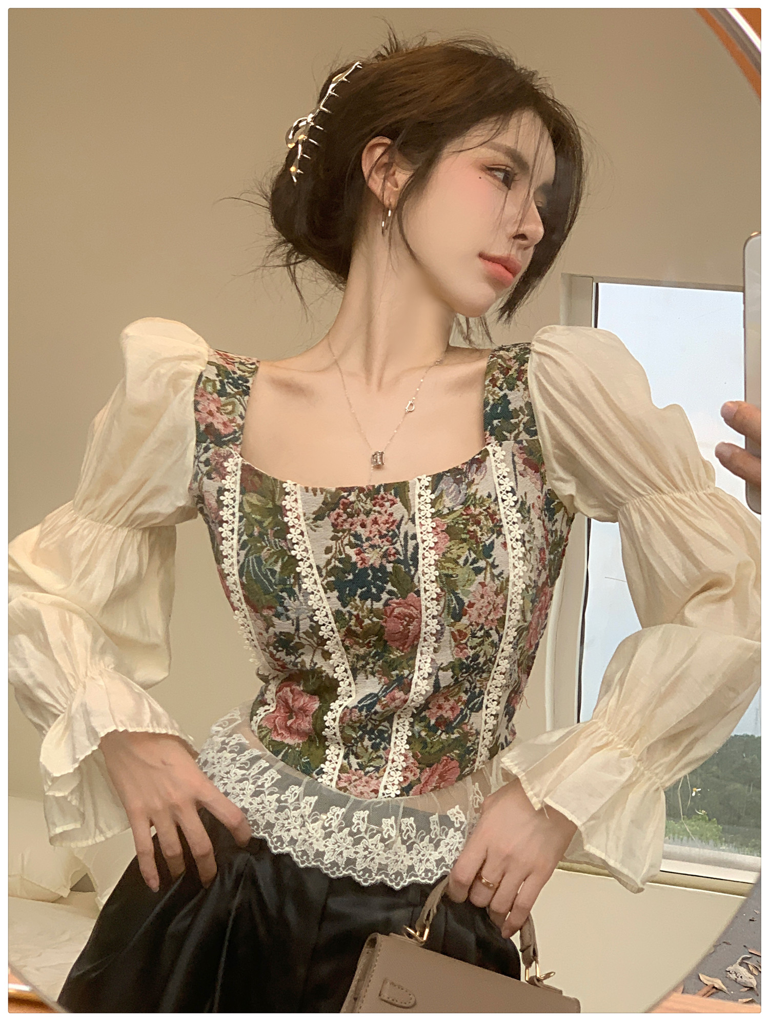 RM25425#法式设计感复古提花方领衬衫洋气修身喇叭袖别致上衣小衫