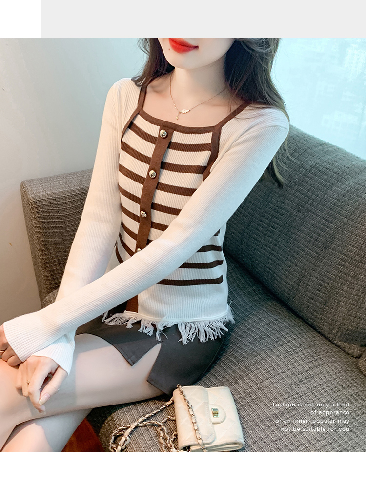 RM25449#新款方领撞色条纹针织衫2023金属扣流苏设计别致上衣