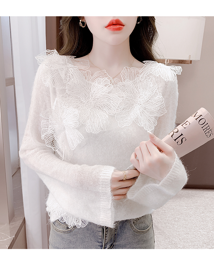 RM25589#立体蕾丝花朵法式复古绝美针织衫女一字肩