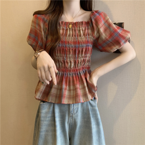 RY1864#褶皱格子一字肩衬衫法式甜美方领泡泡袖上衣女
