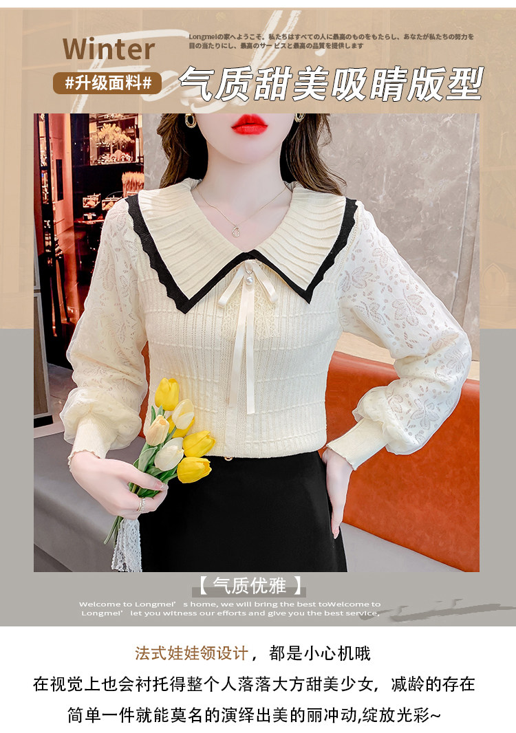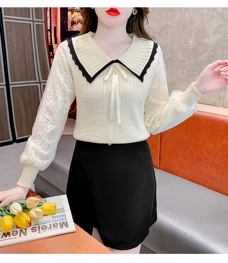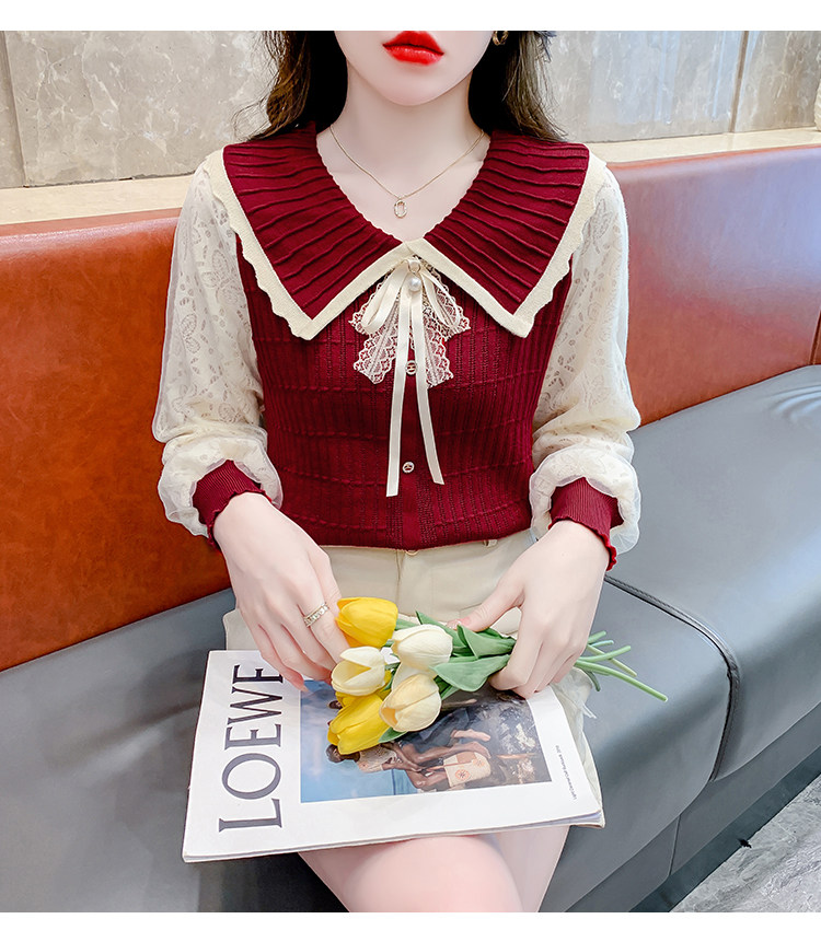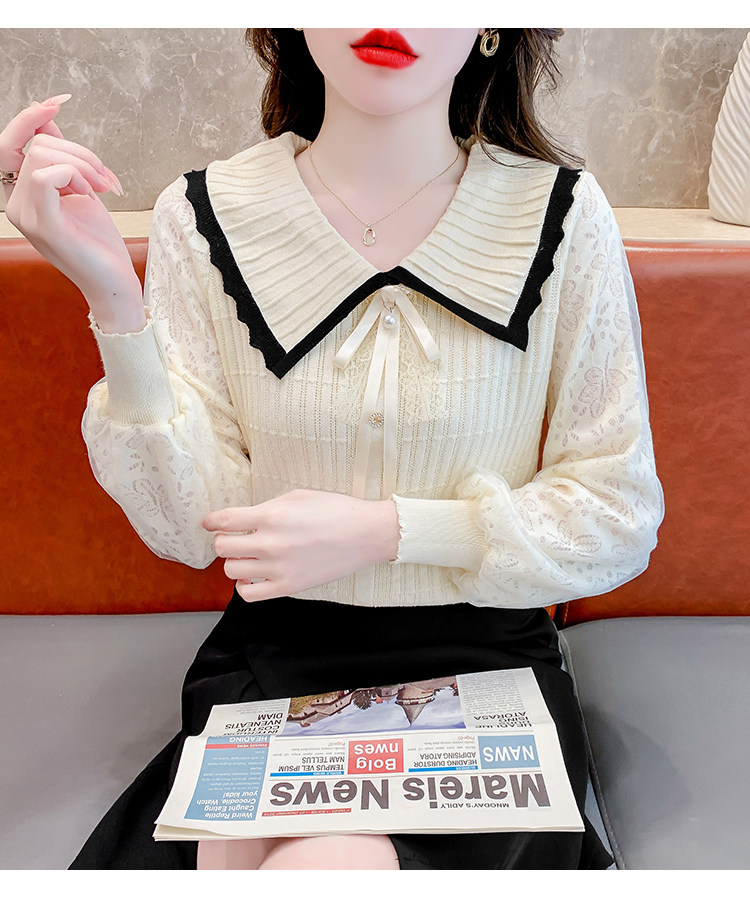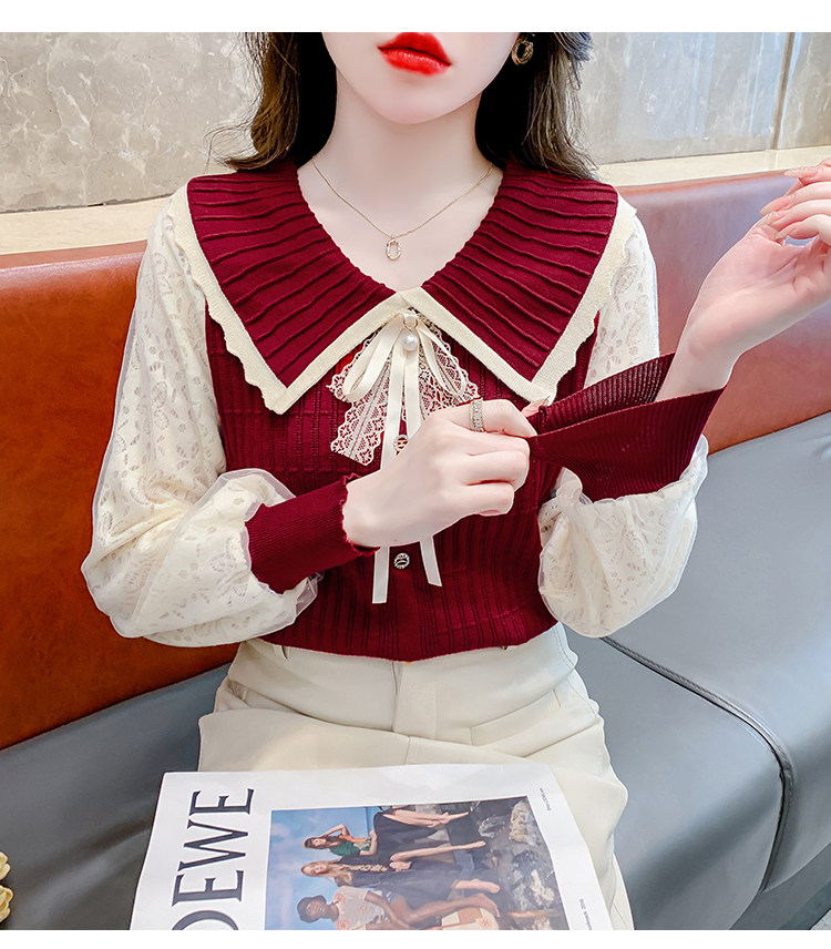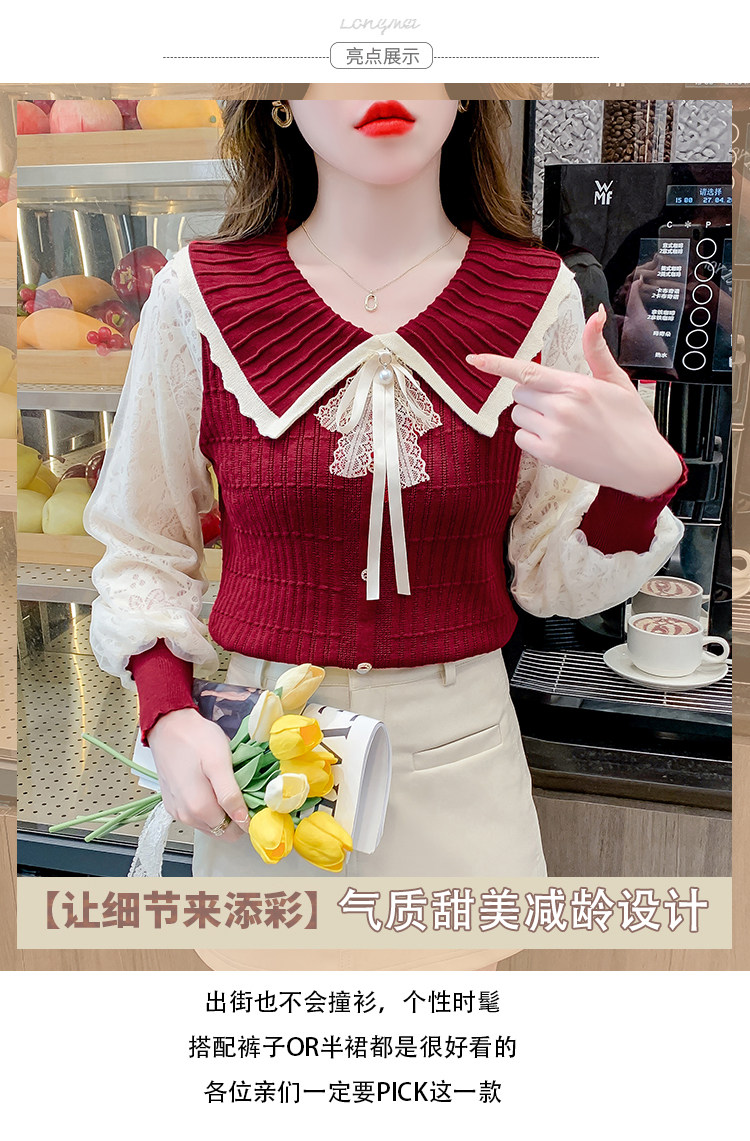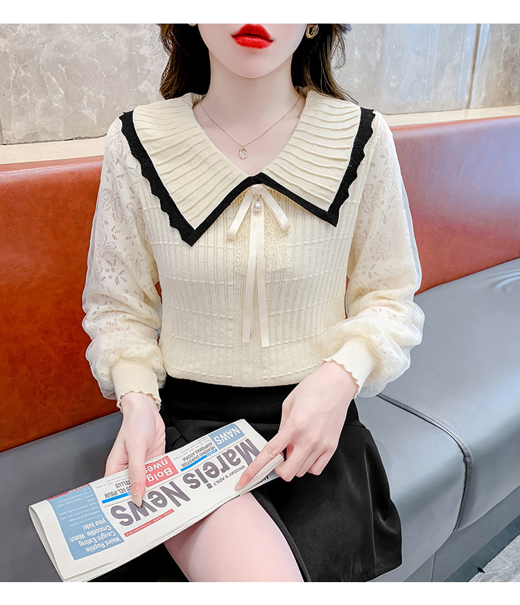 RM25869#气质甜美蝴蝶结长袖针织衫女秋季新款蕾丝拼接娃娃领韩版打底上衣