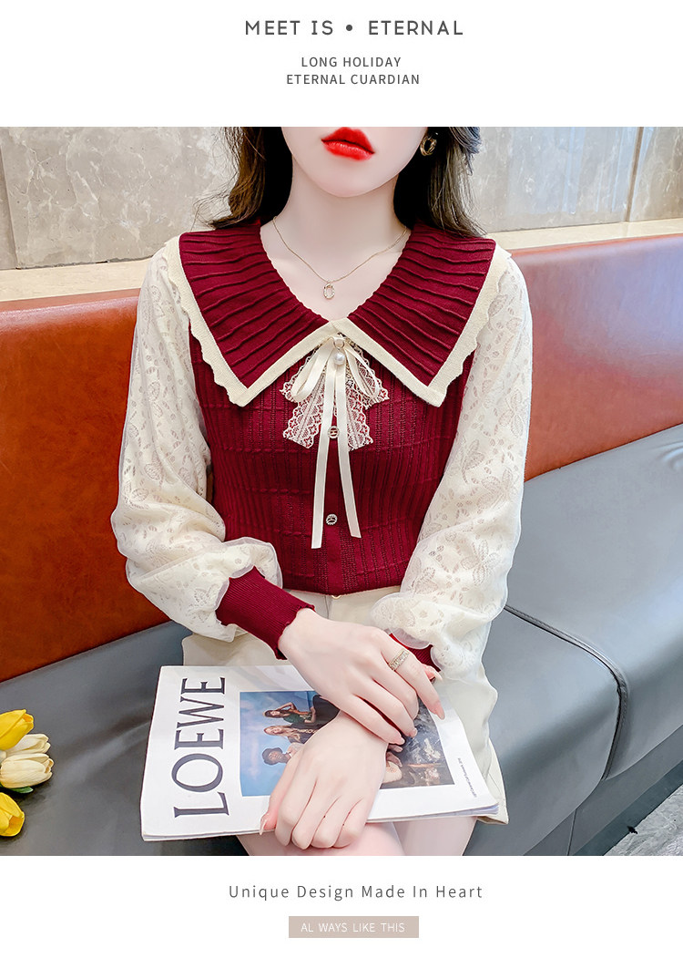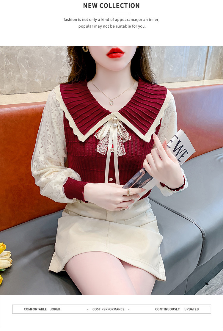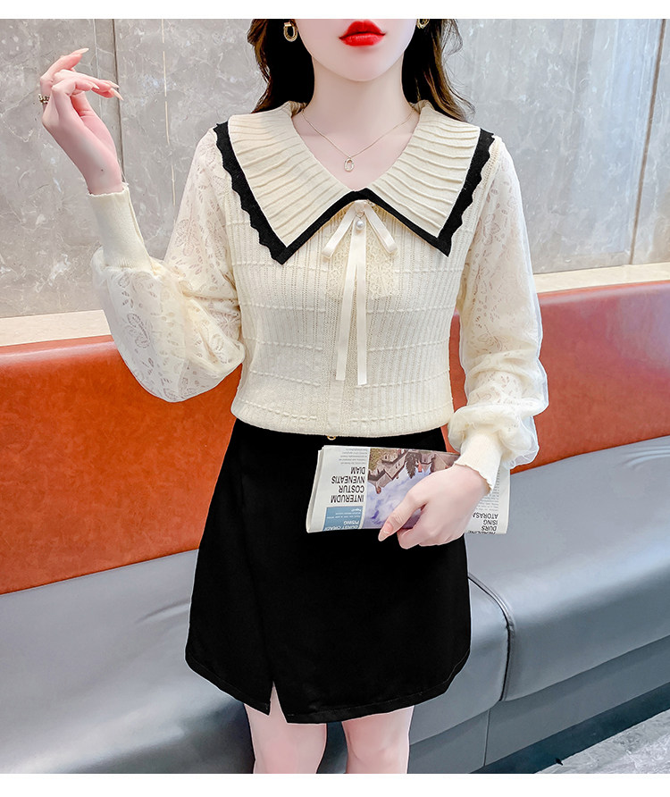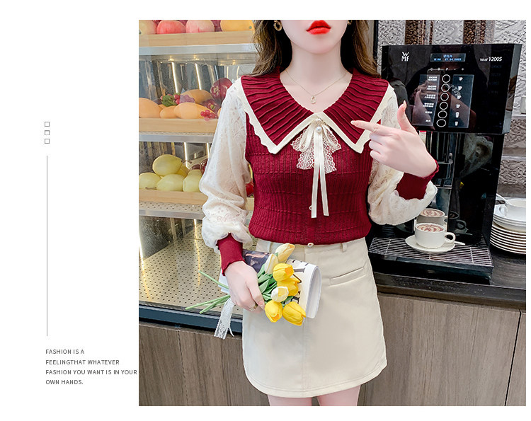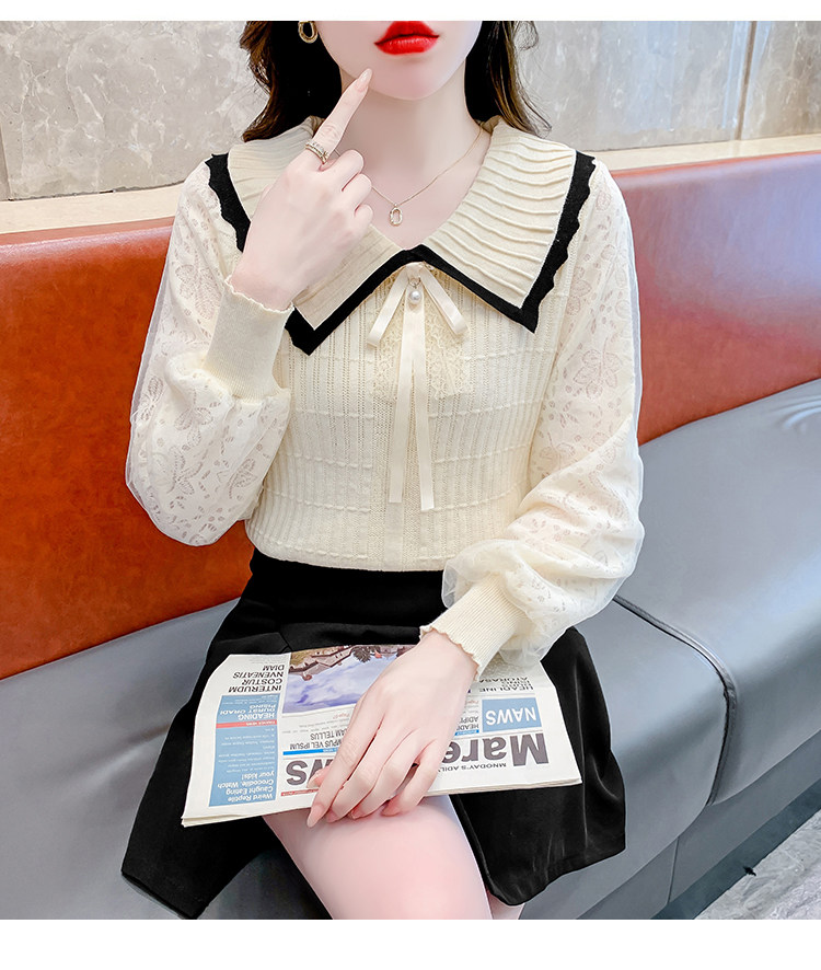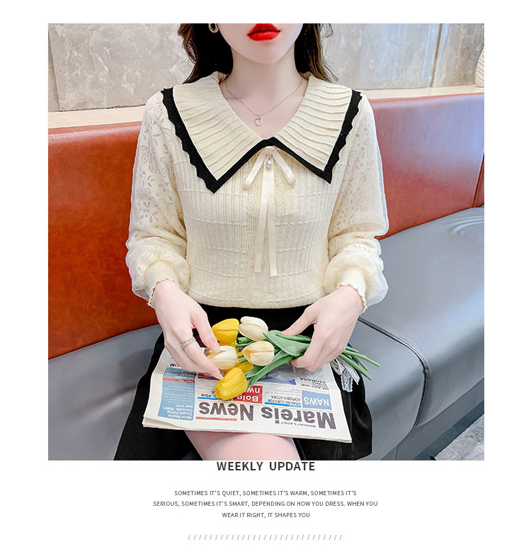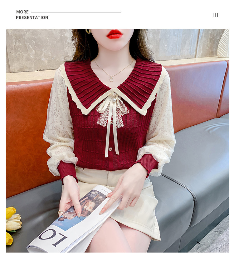 RM25869#气质甜美蝴蝶结长袖针织衫女秋季新款蕾丝拼接娃娃领韩版打底上衣