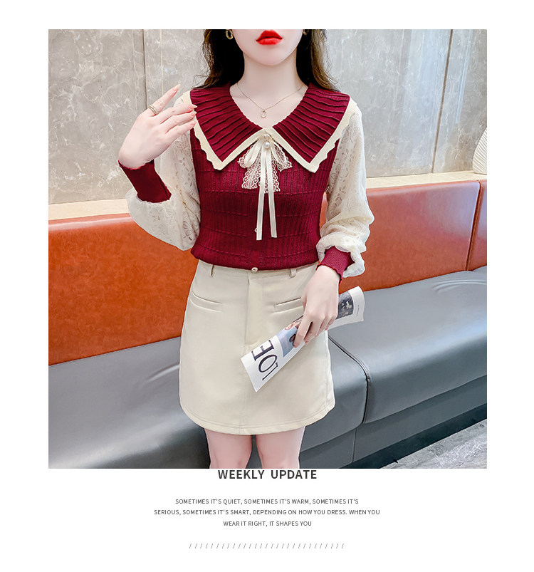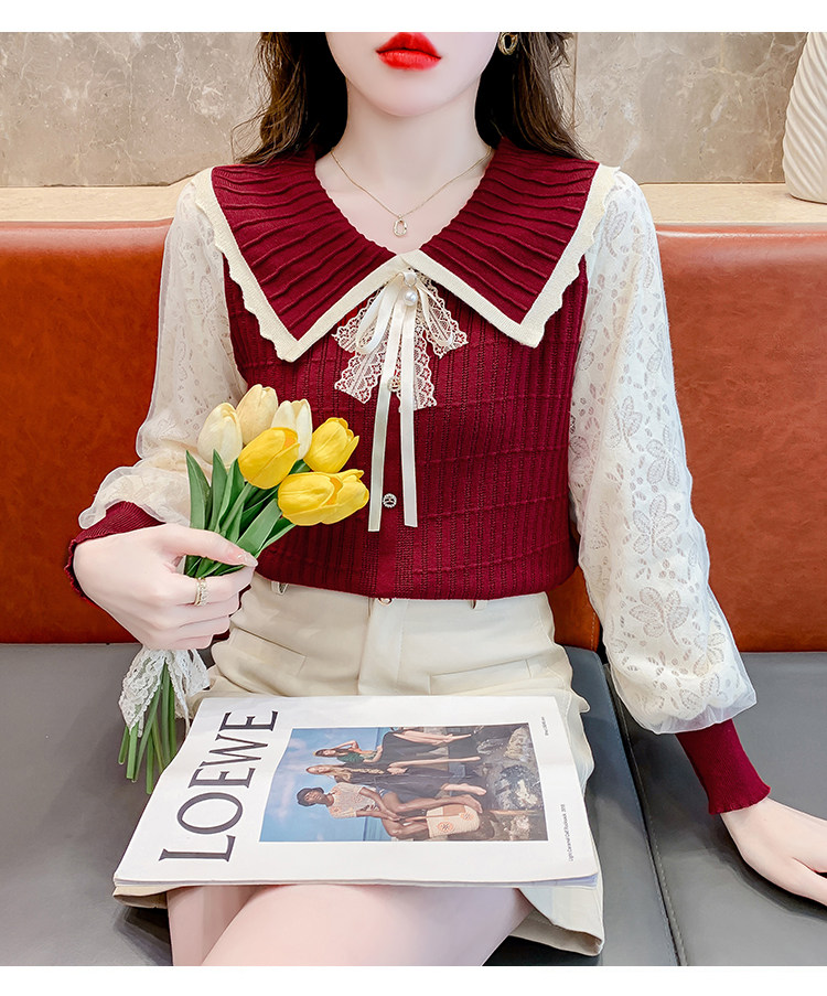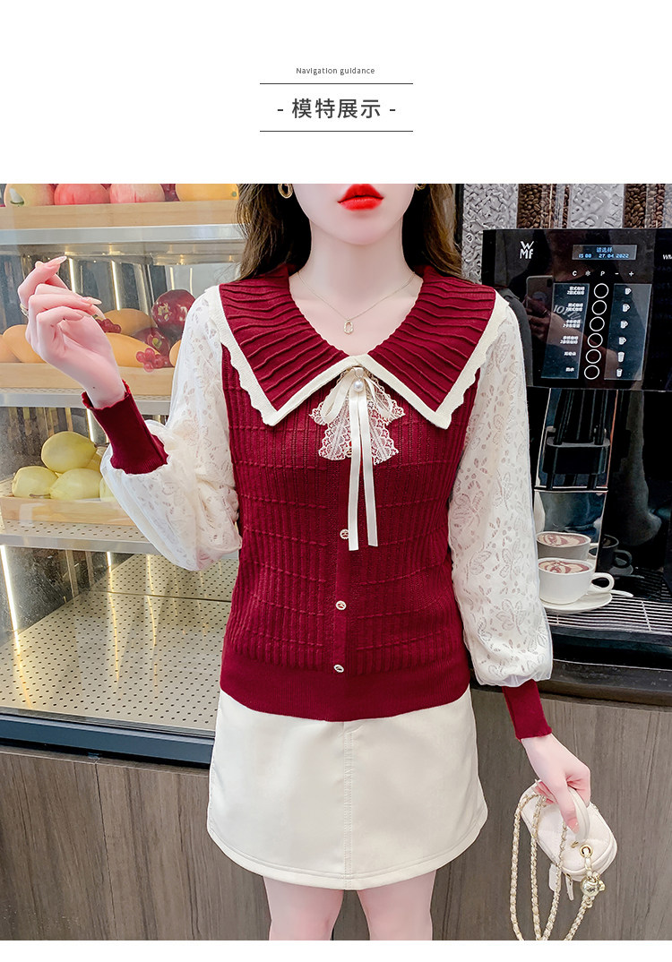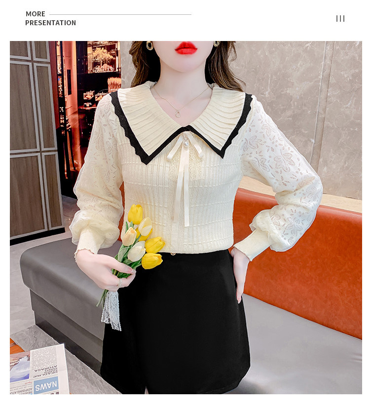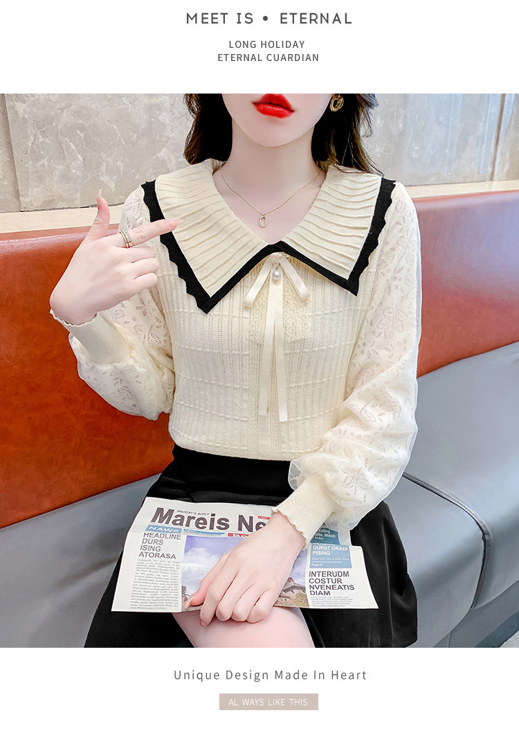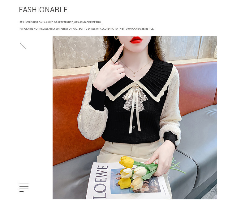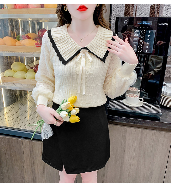 RM25869#气质甜美蝴蝶结长袖针织衫女秋季新款蕾丝拼接娃娃领韩版打底上衣