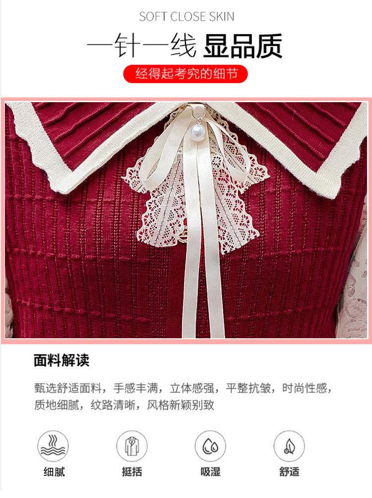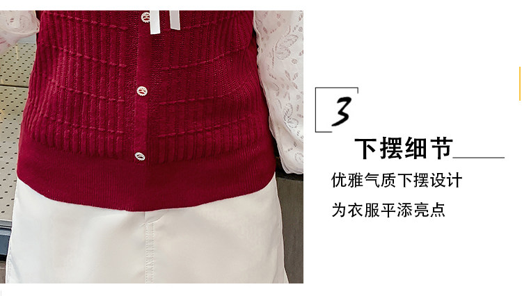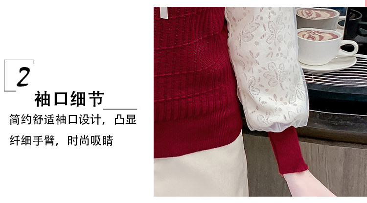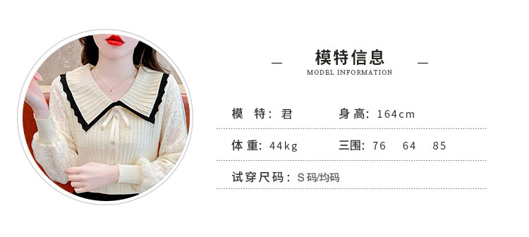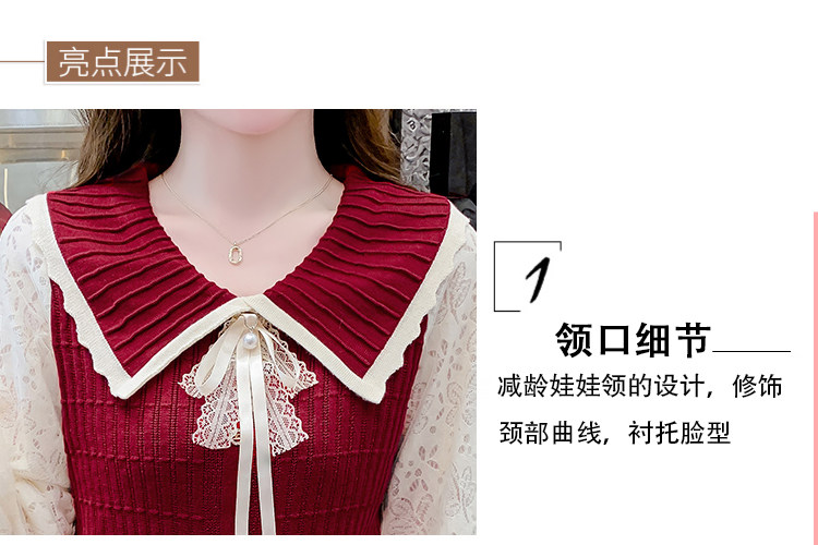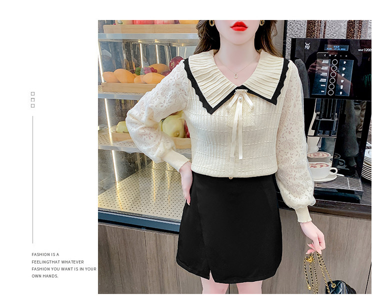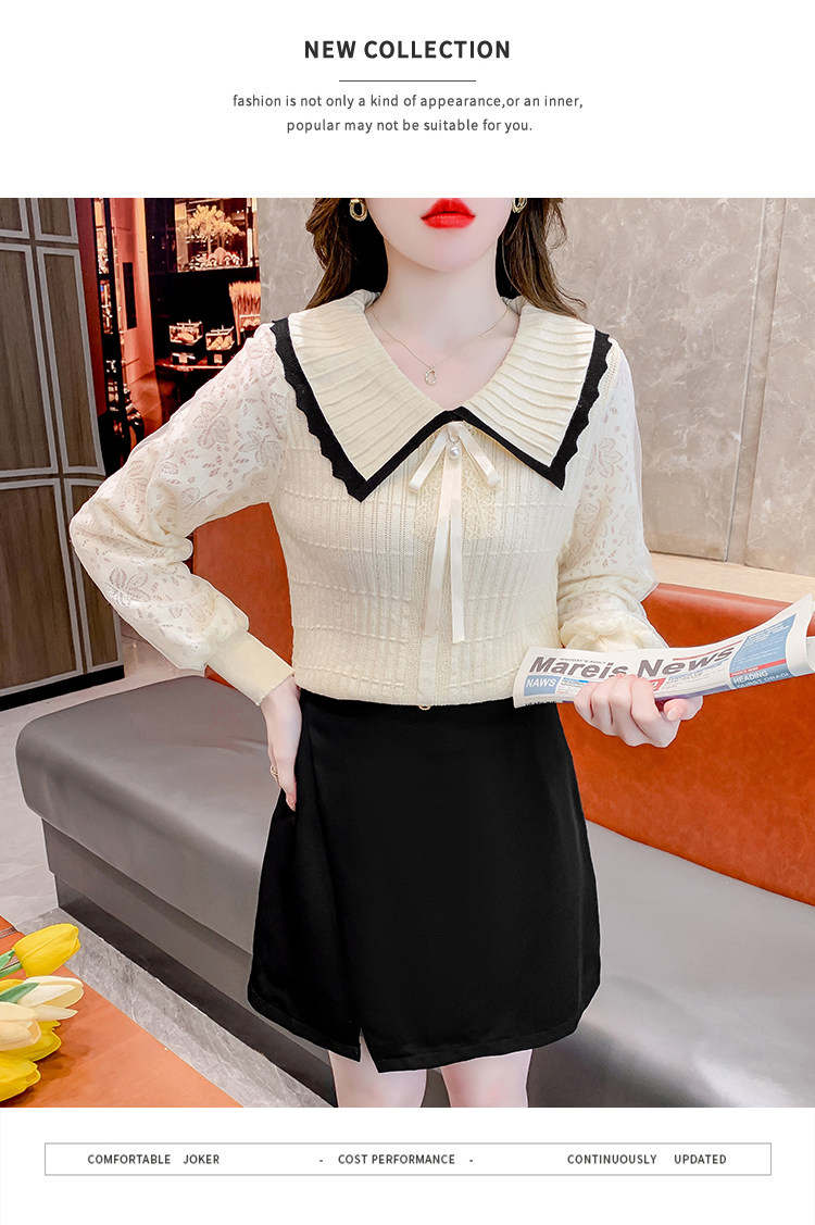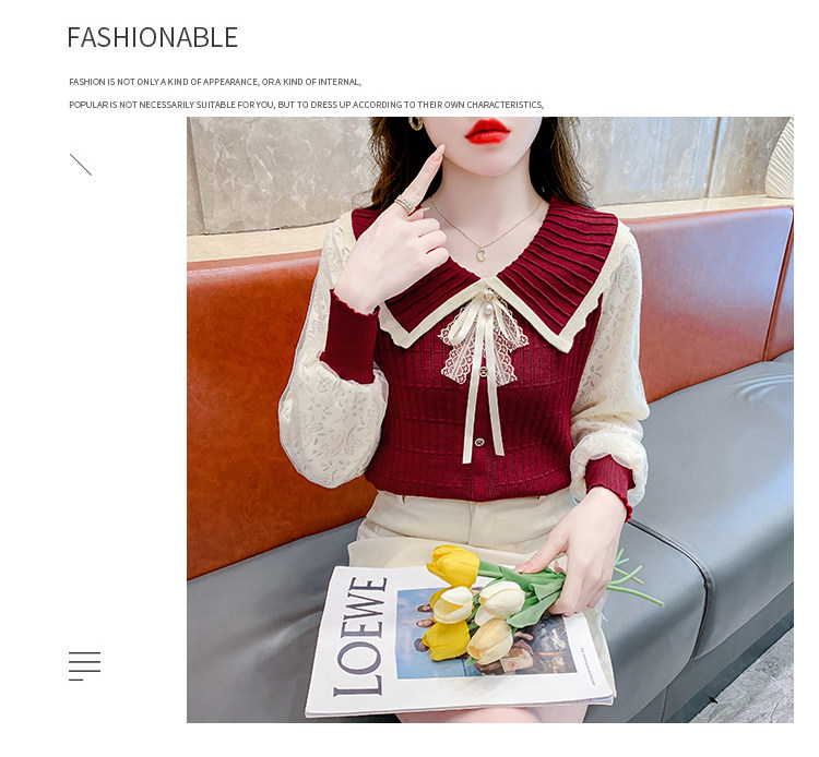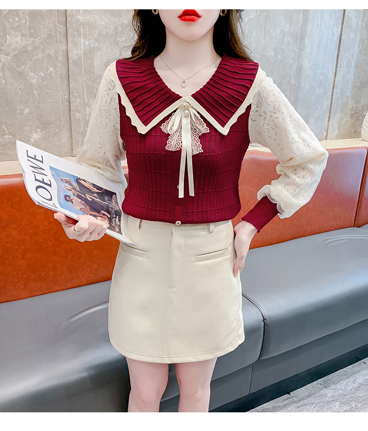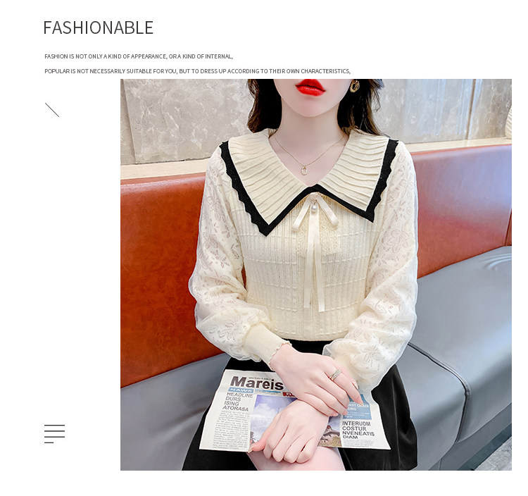 RM25869#气质甜美蝴蝶结长袖针织衫女秋季新款蕾丝拼接娃娃领韩版打底上衣