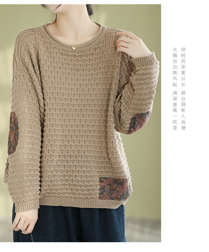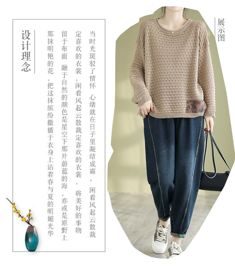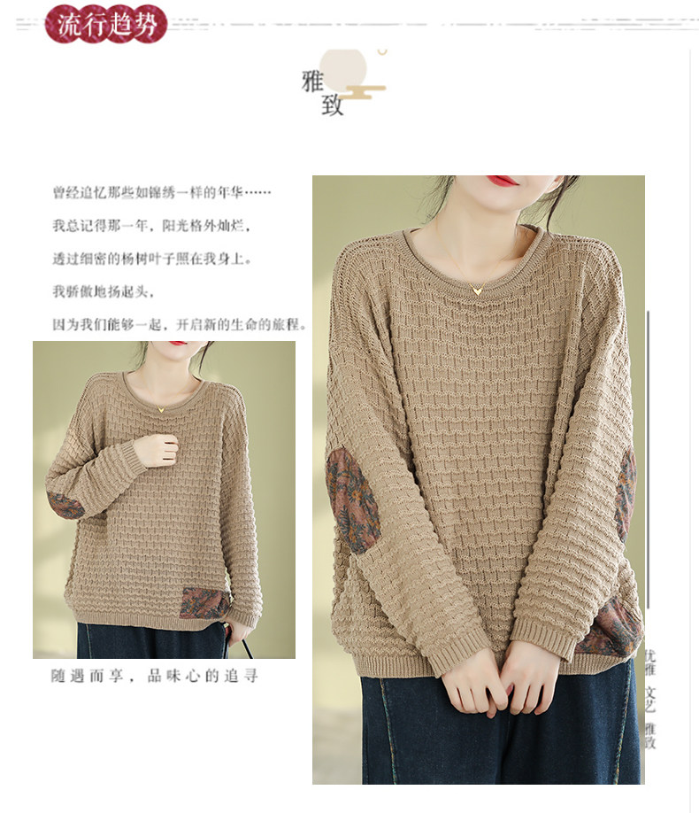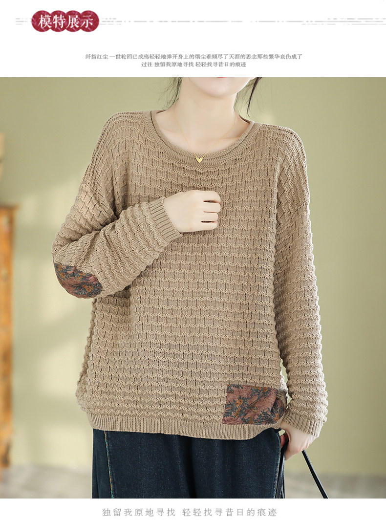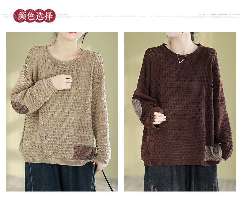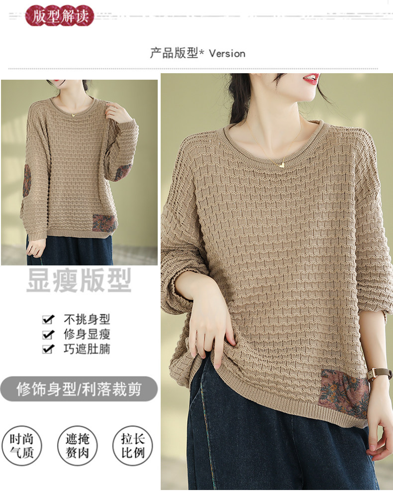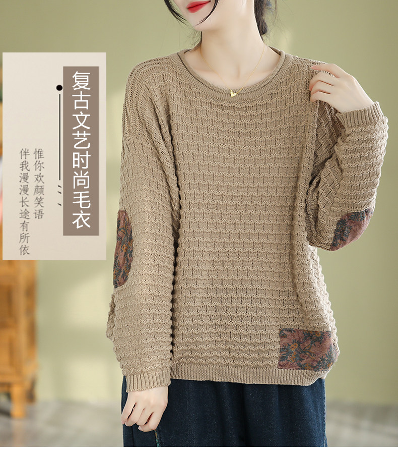 RM25945#复古贴布针织毛衣女秋冬宽松慵懒2023民族风圆领套头长袖毛衣
