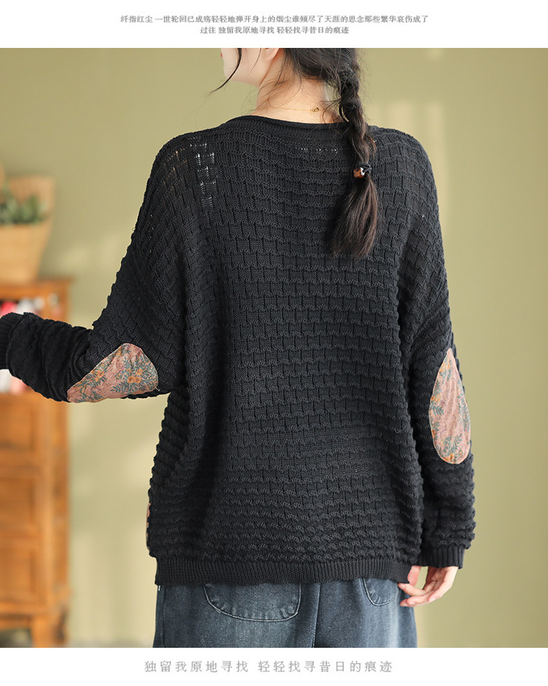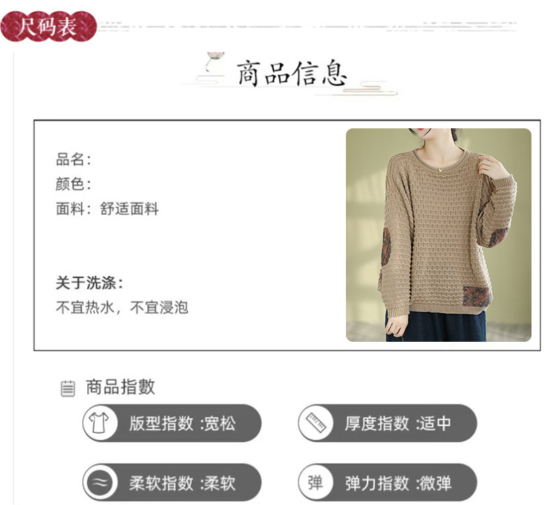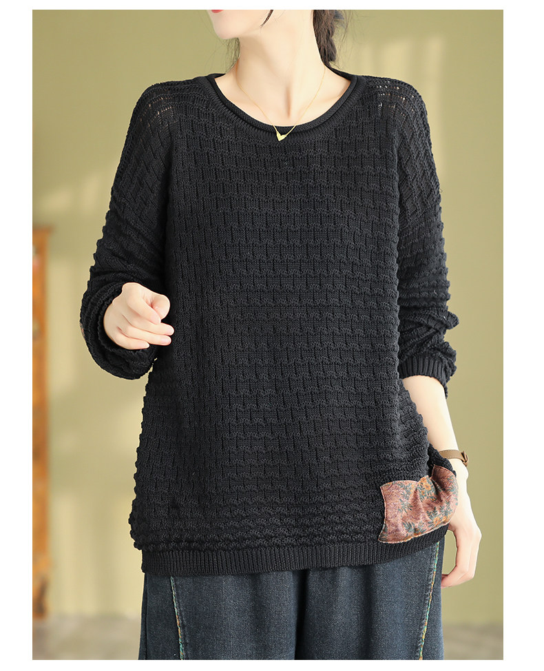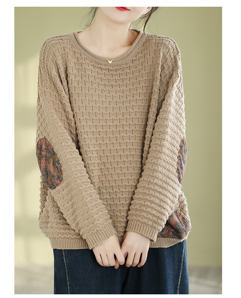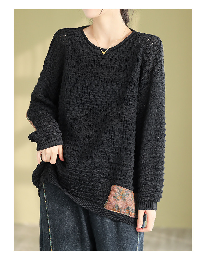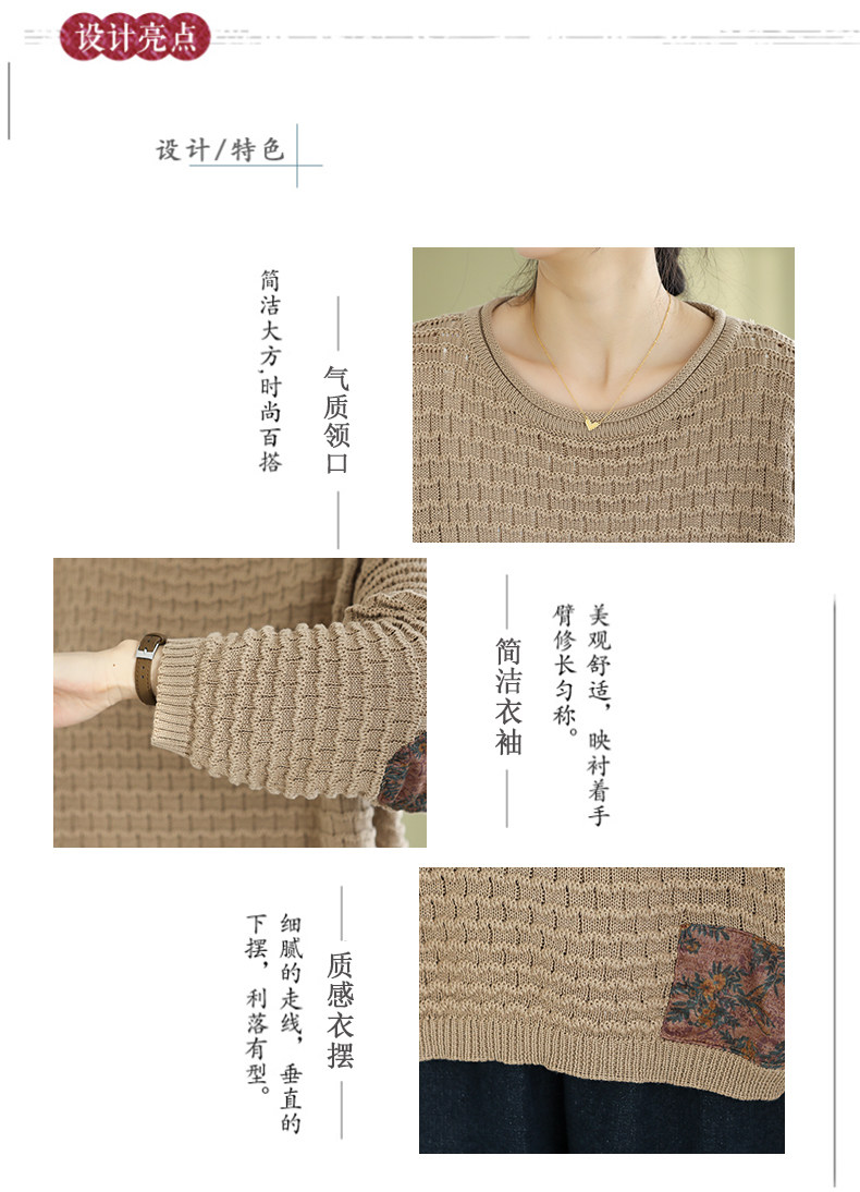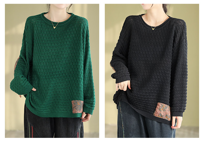 RM25945#复古贴布针织毛衣女秋冬宽松慵懒2023民族风圆领套头长袖毛衣