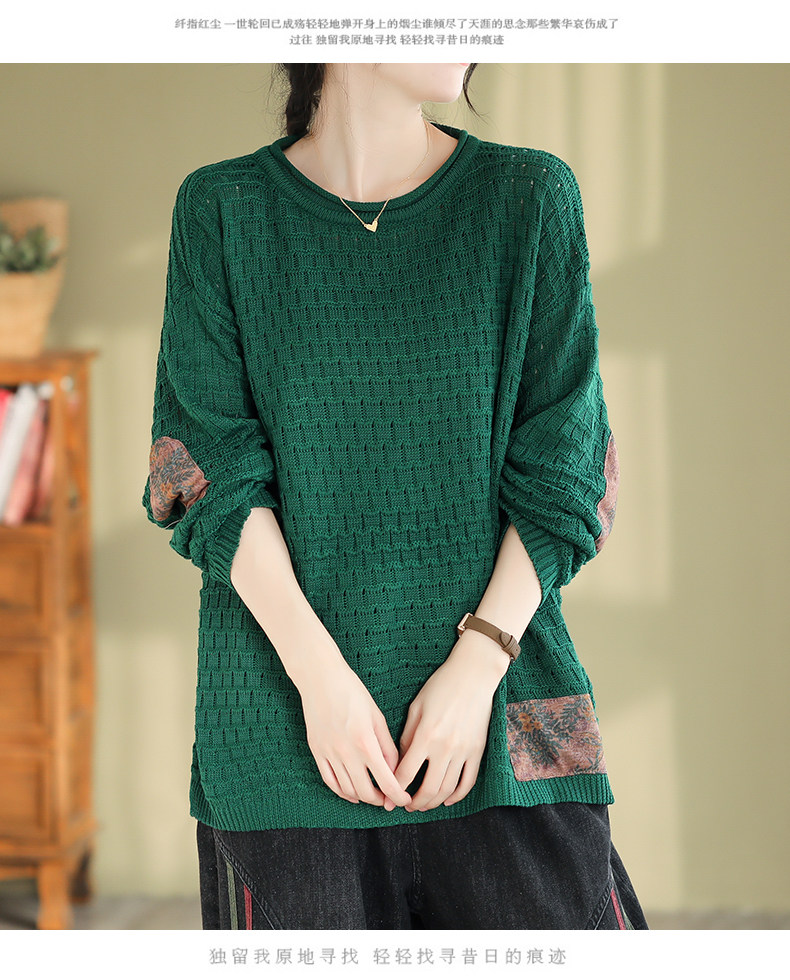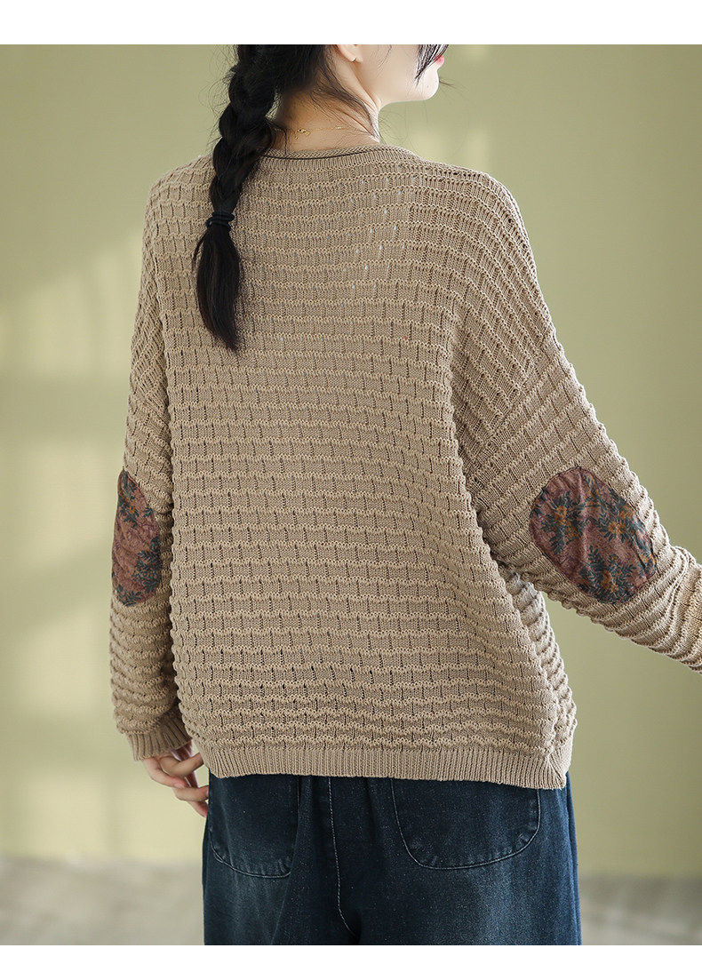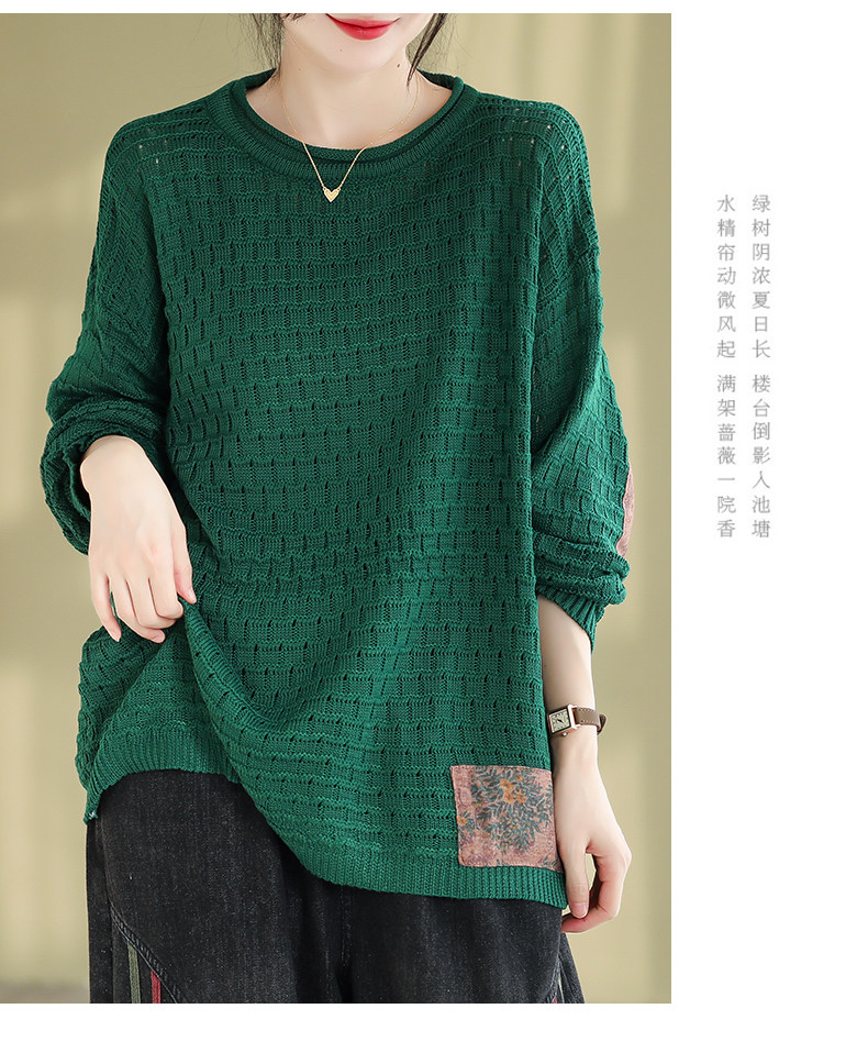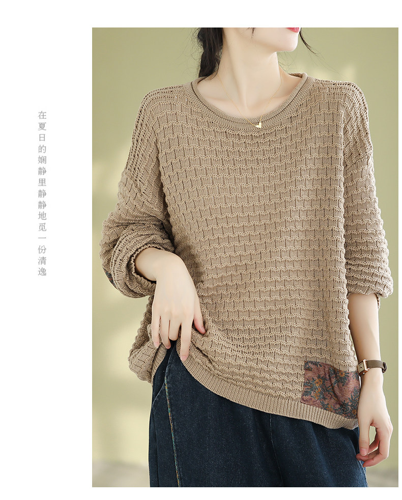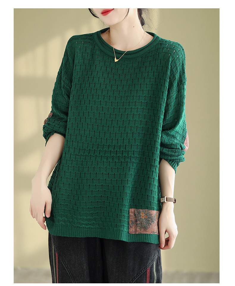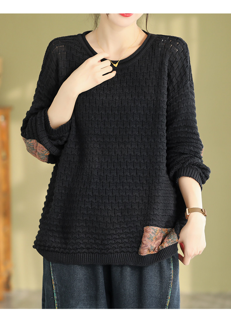 RM25945#复古贴布针织毛衣女秋冬宽松慵懒2023民族风圆领套头长袖毛衣