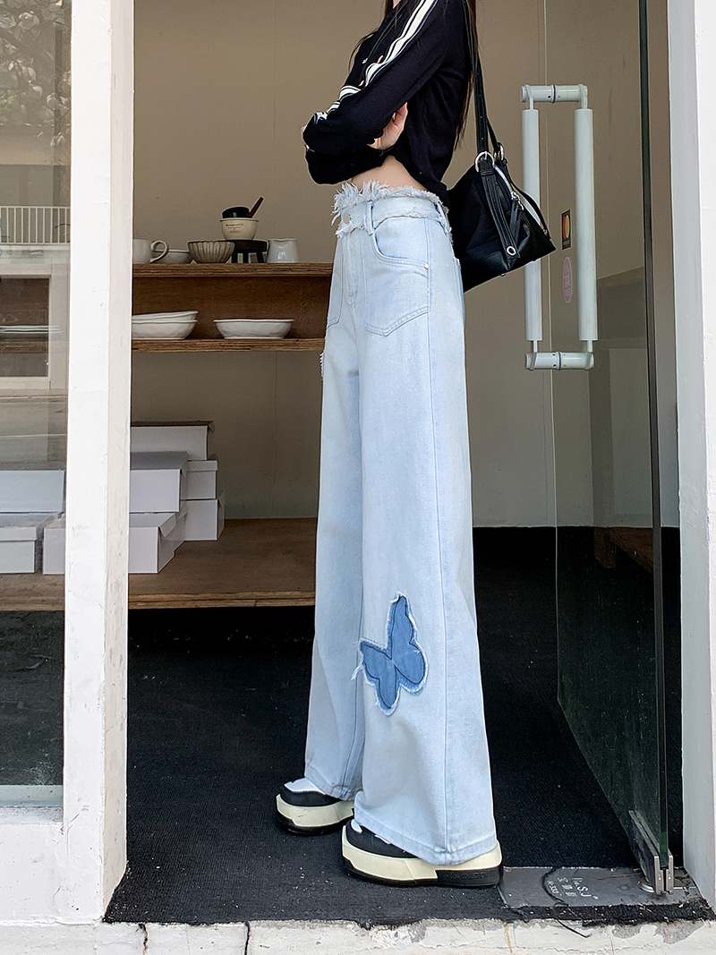 RM26221#蝴蝶毛边直筒牛仔裤女2023年秋季新款高腰显瘦阔腿裤子
