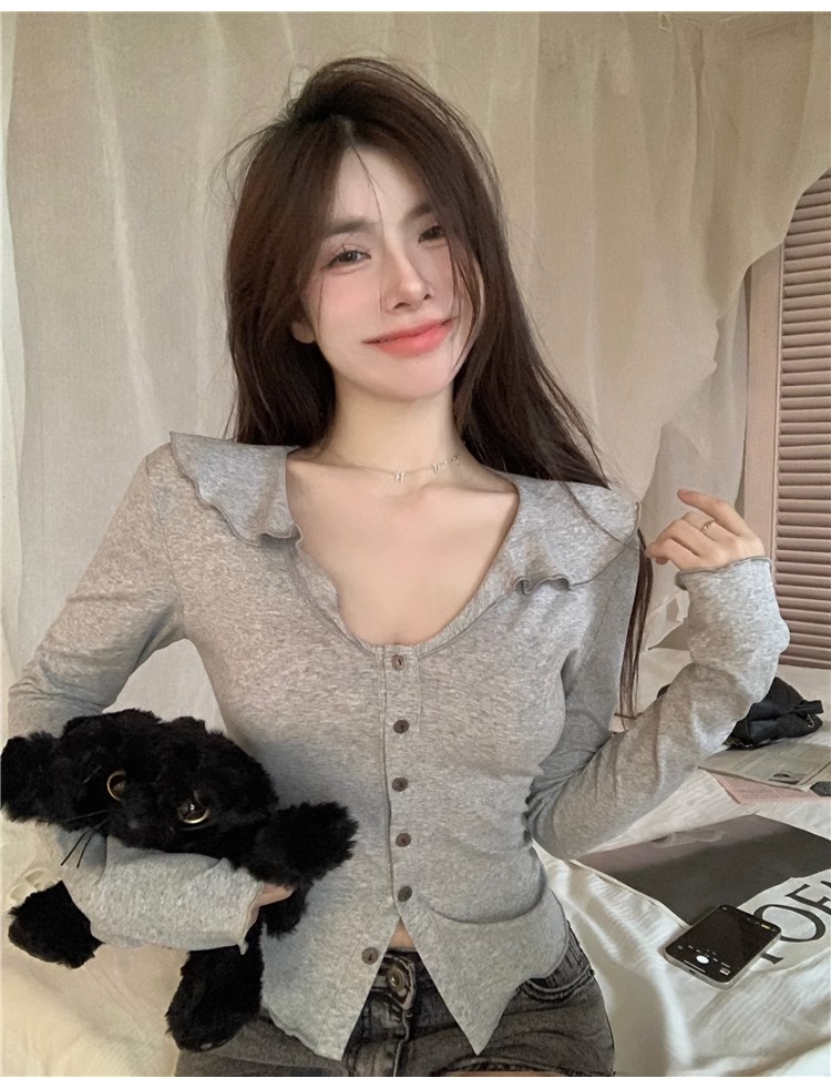 RM26550#复古木耳边长袖T恤女早秋新款修身显瘦针织开衫气上衣6535棉