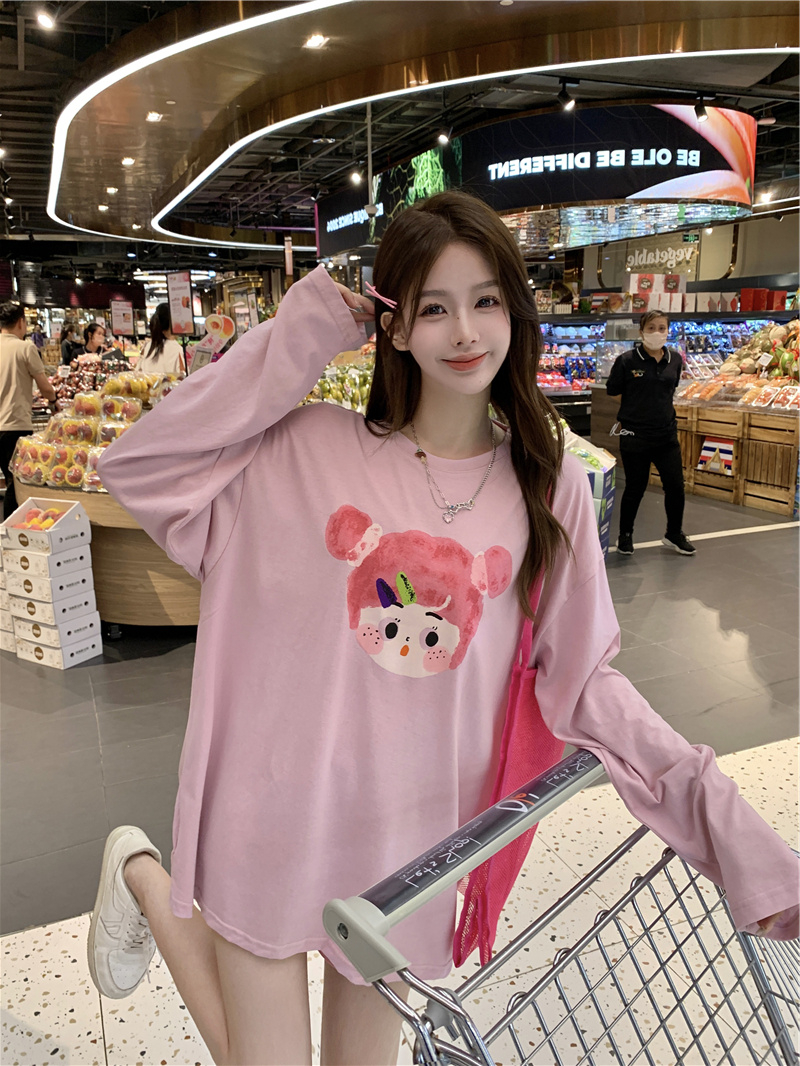 RM26552#丸子头女孩长袖T恤女秋季百搭甜美粉色卡通印花休闲中长款上衣