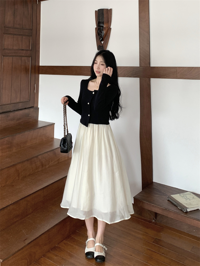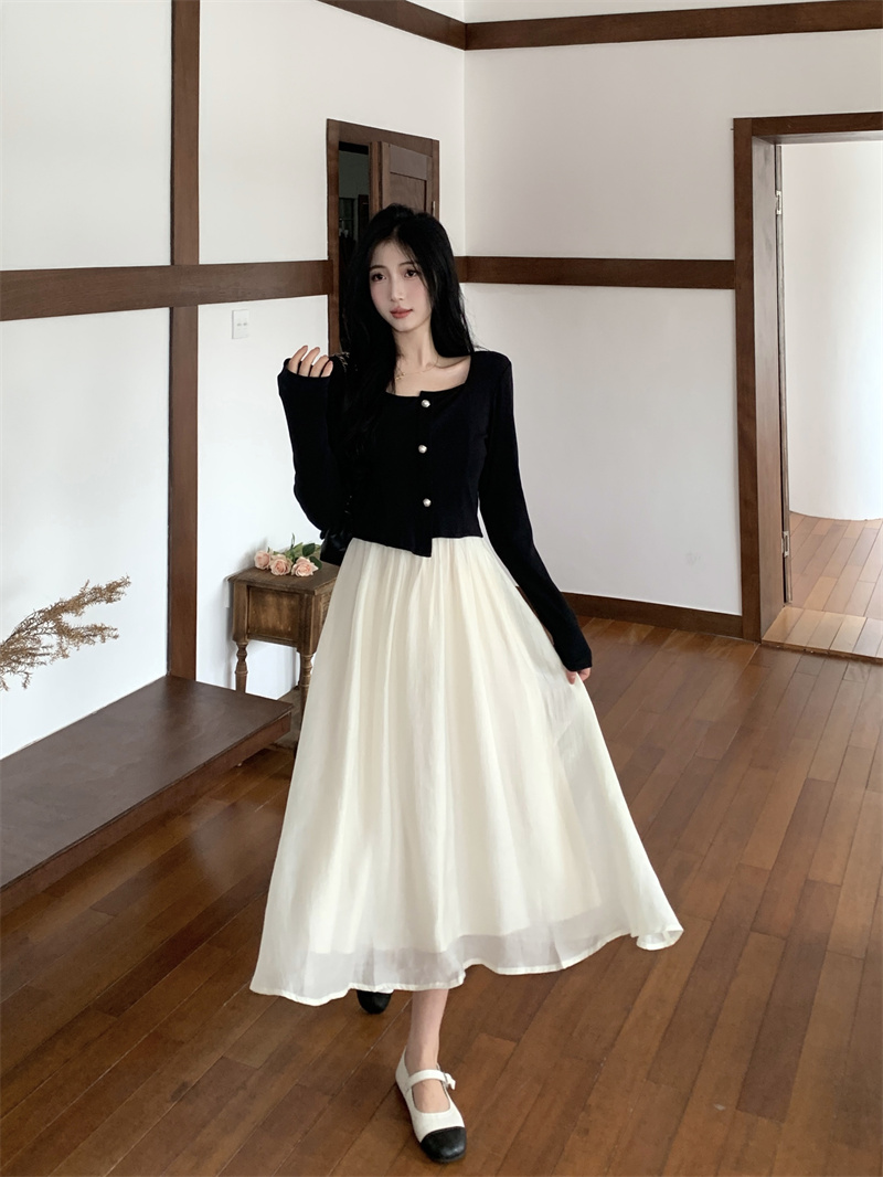 RM26980#大码假两件方领长袖连衣裙女2023赫本风设计感套头显瘦长裙秋