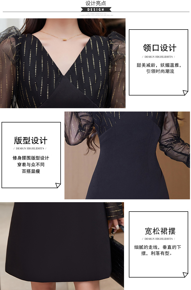 RM26994#气质轻奢修身网纱V领泡泡袖连衣裙