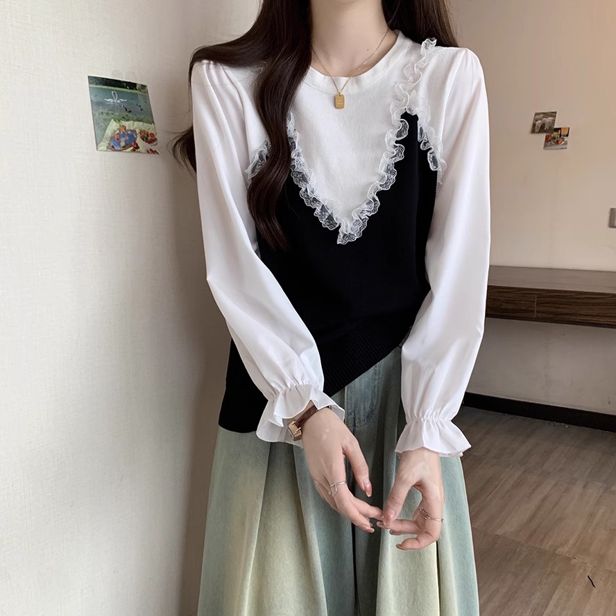 RM27065#新款女装胖妹妹大码上衣网纱木耳边设计假两件条纹针织毛衣女