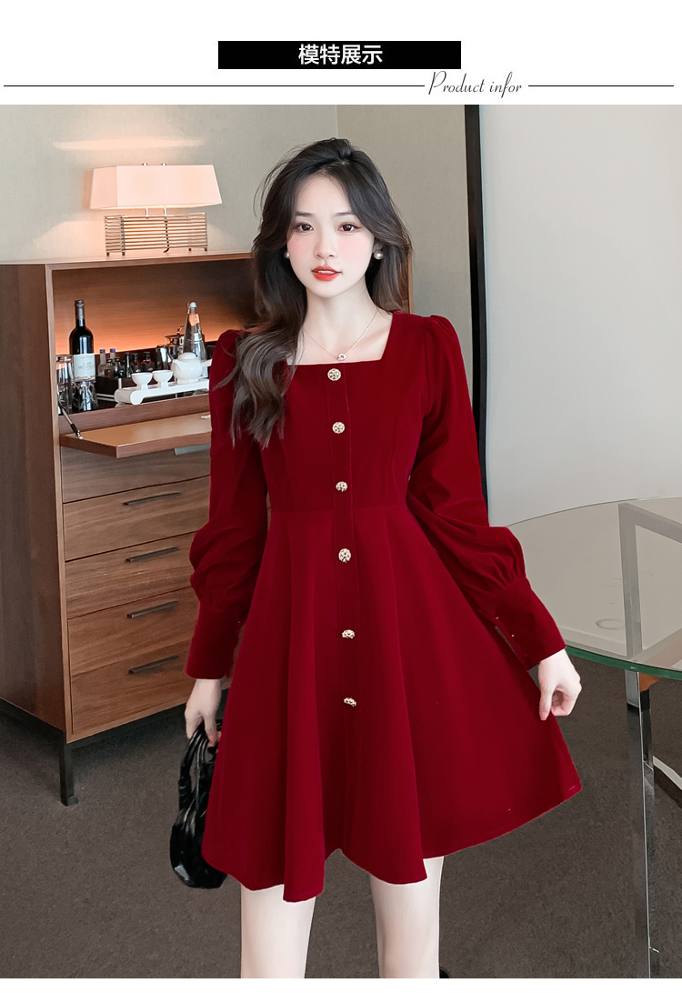 RM27452#新款秋装气质女神范法式丝绒赫本风小个子红色连衣裙女