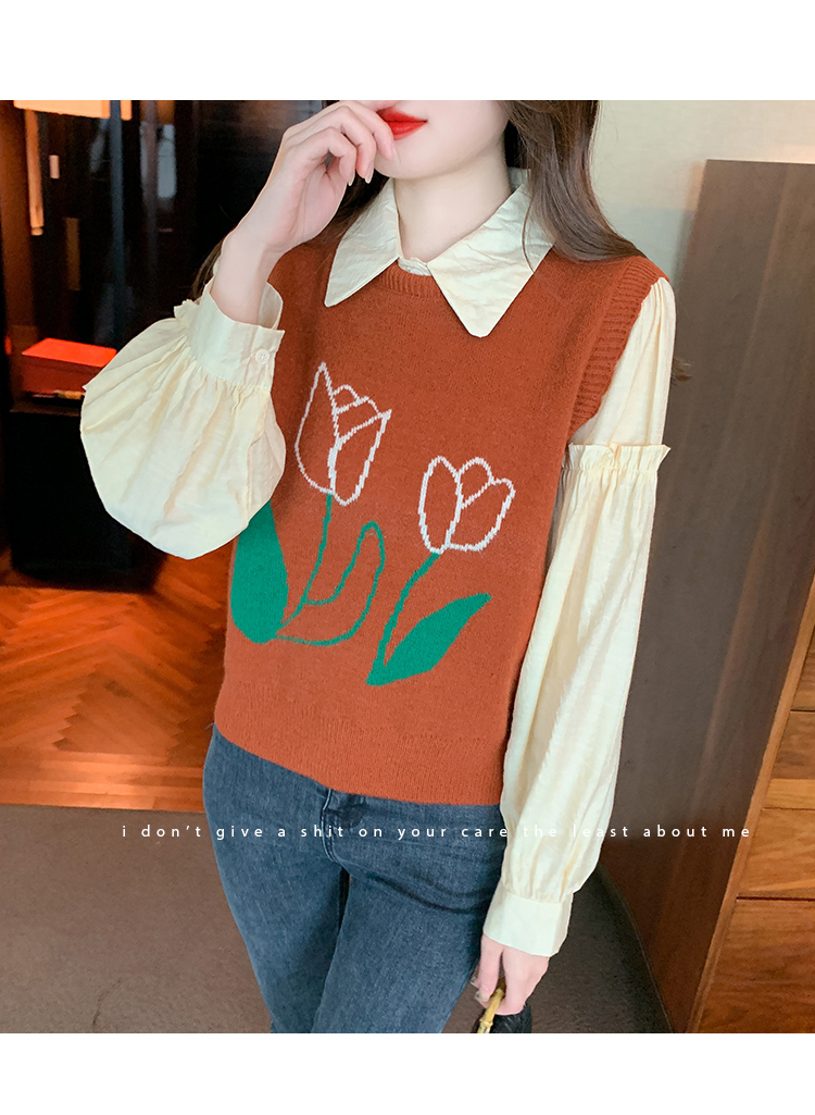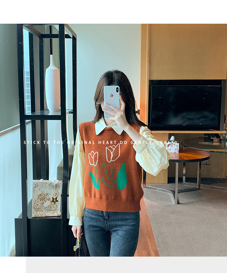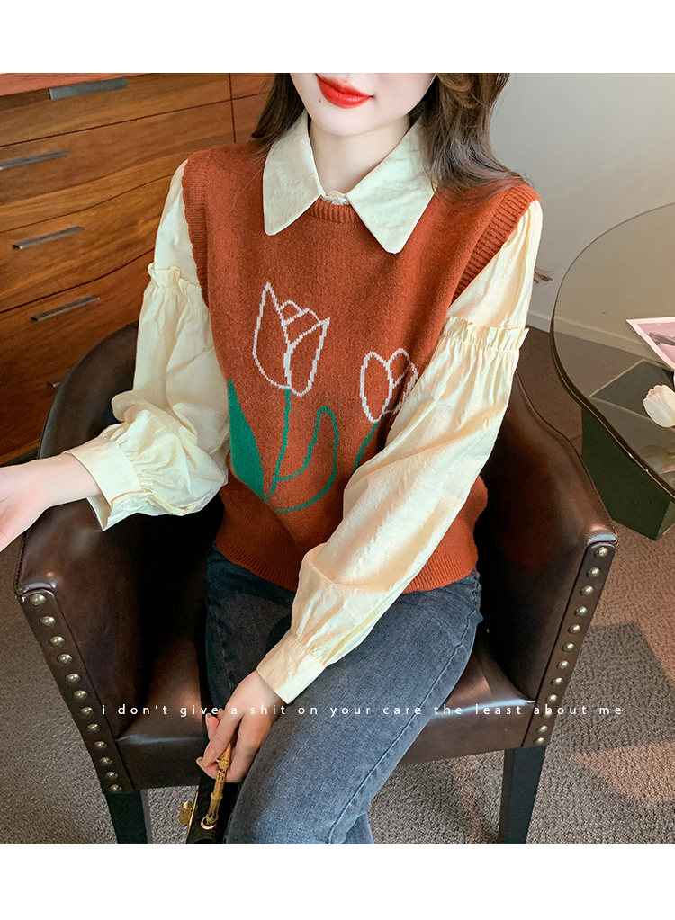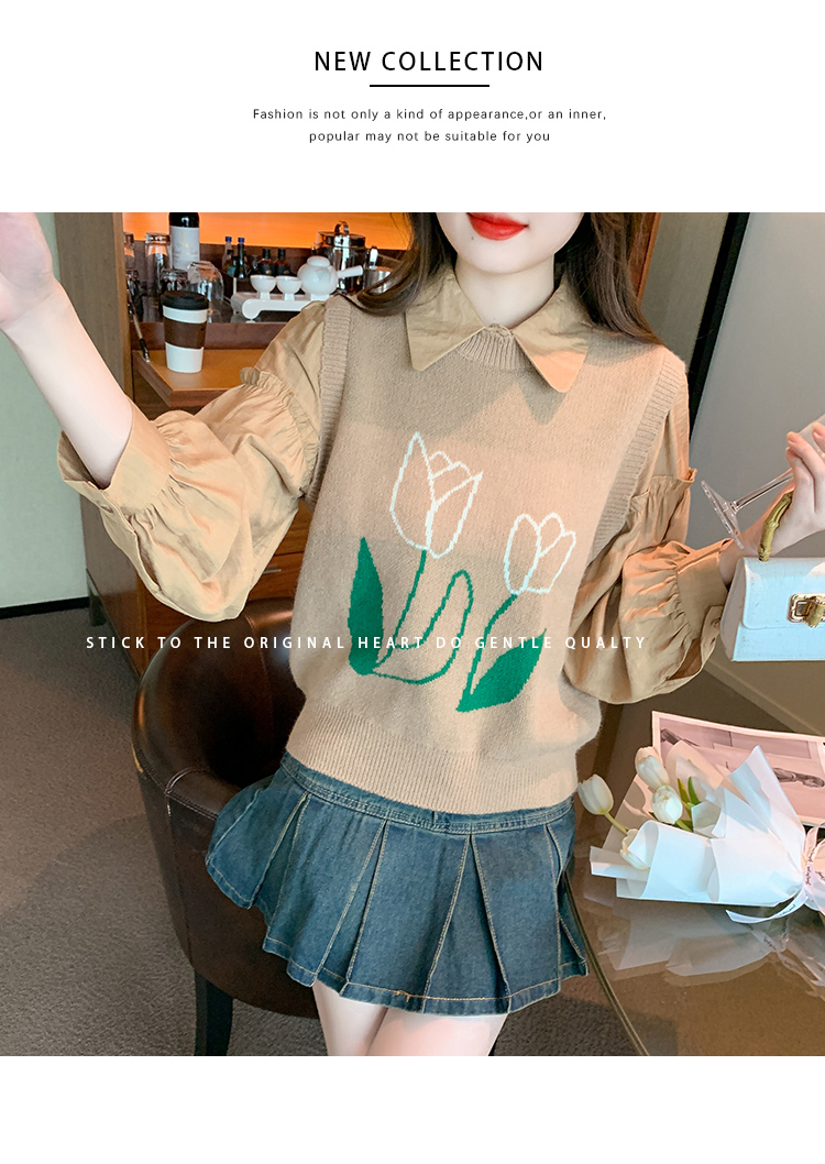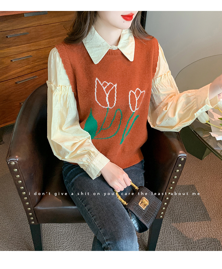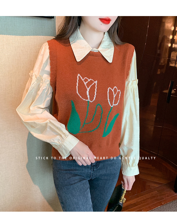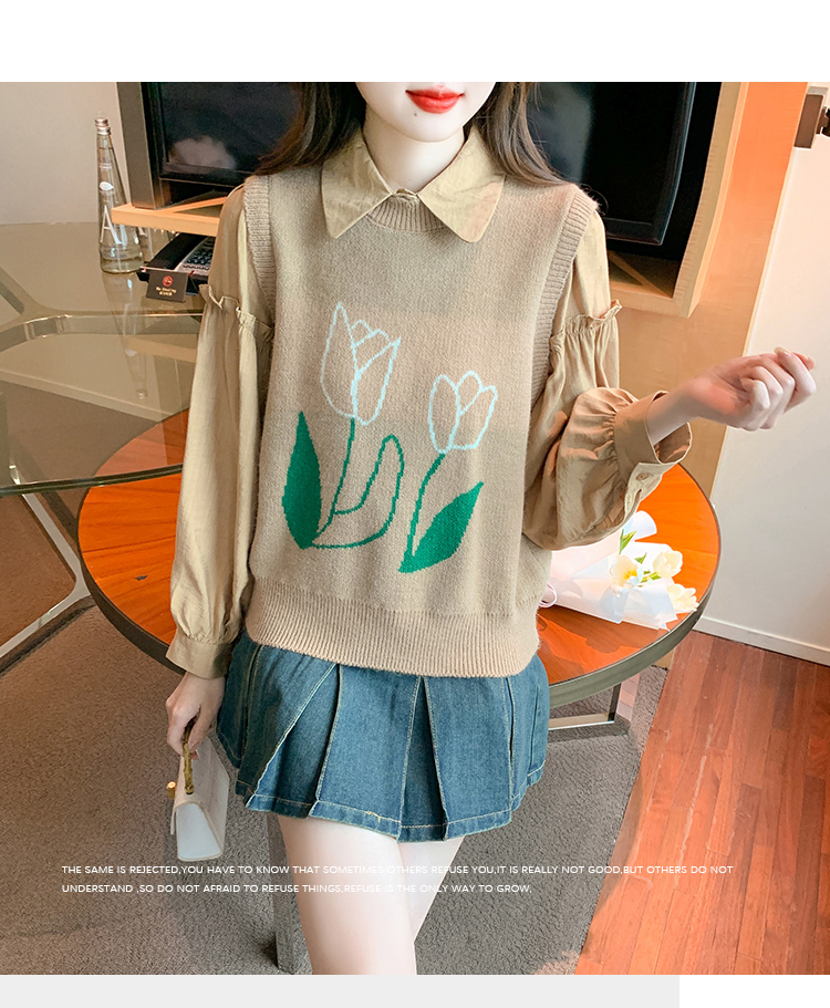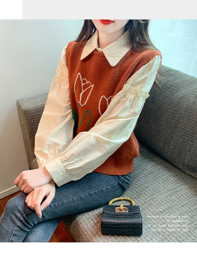 RM29813#郁金香刺绣设计感毛衣马甲+韩版宽松长袖衬衫两件套装