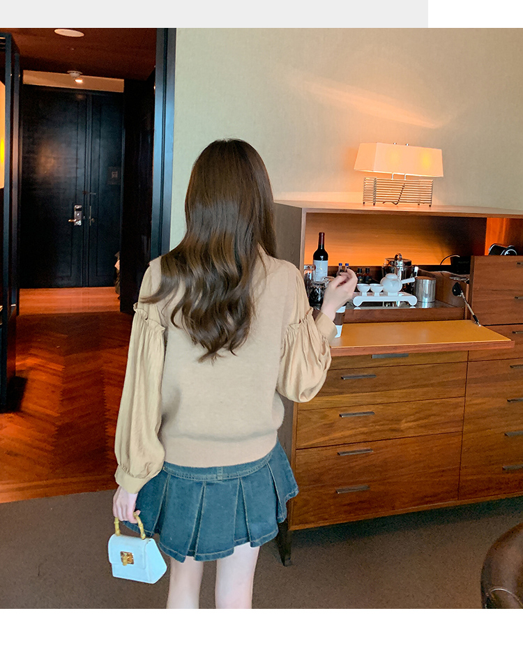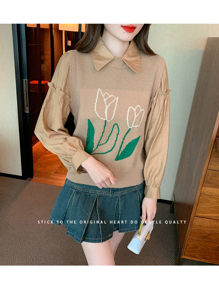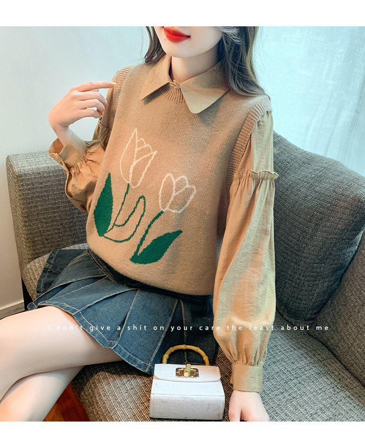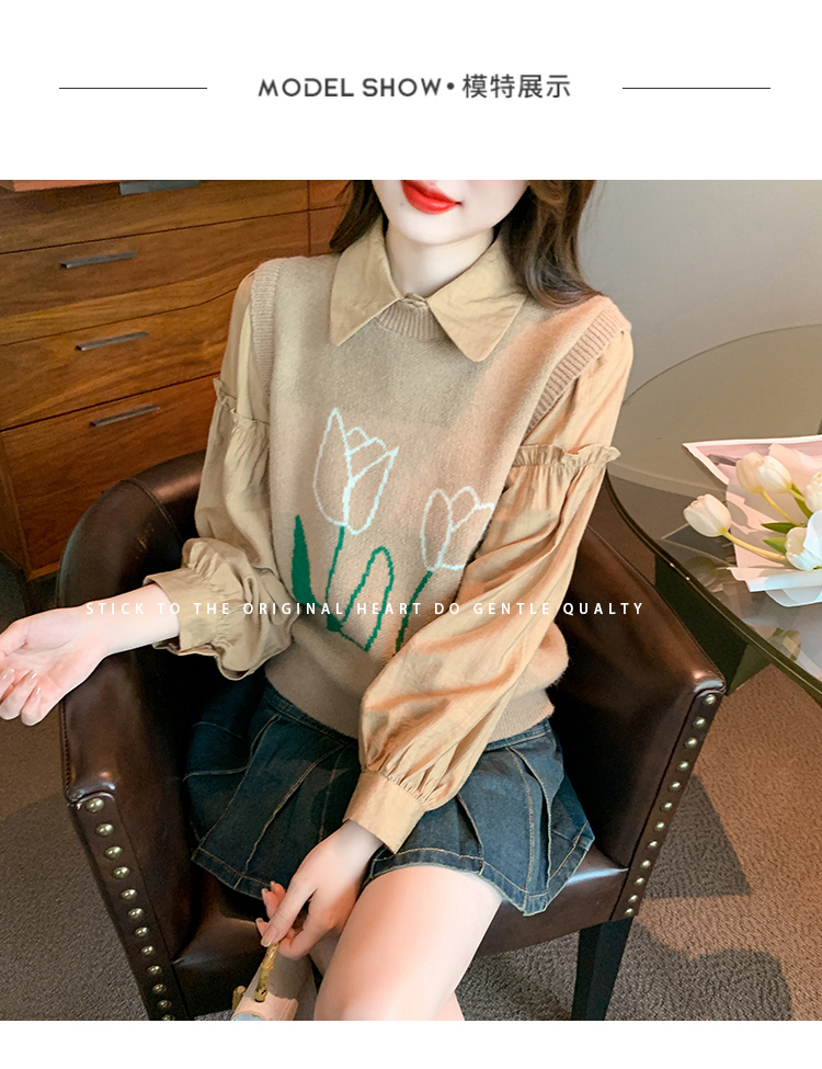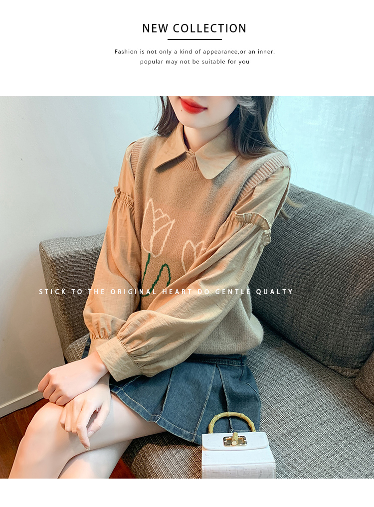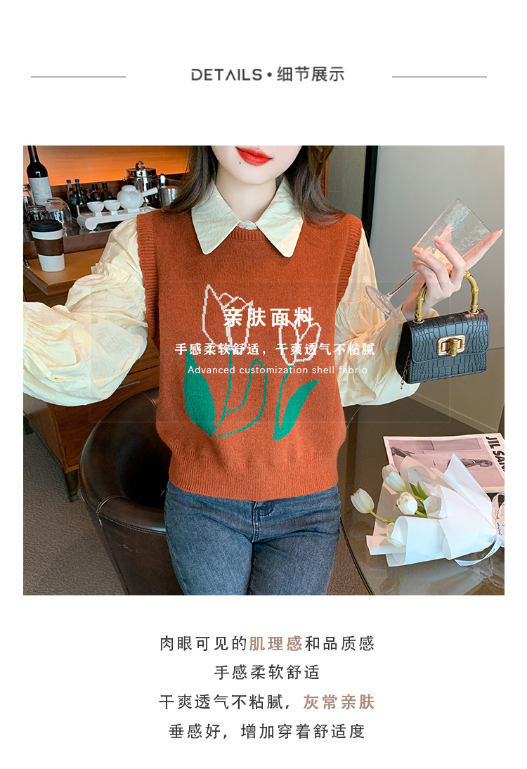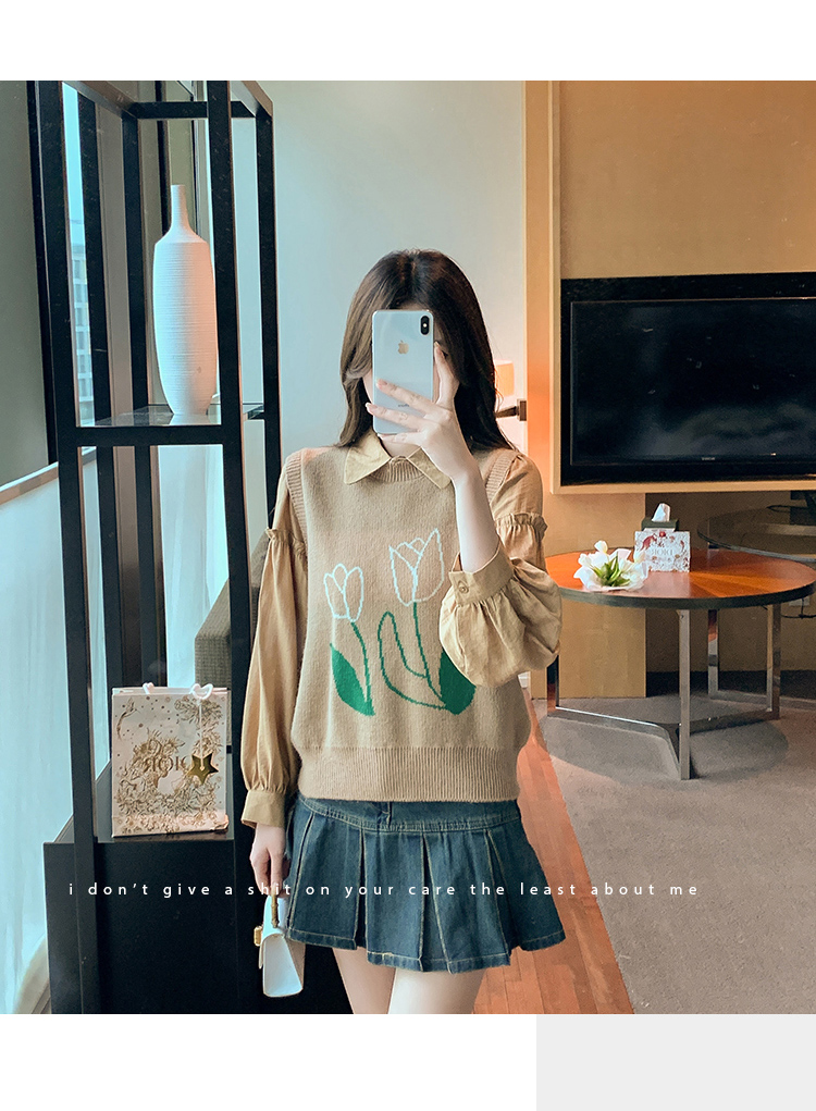 RM29813#郁金香刺绣设计感毛衣马甲+韩版宽松长袖衬衫两件套装