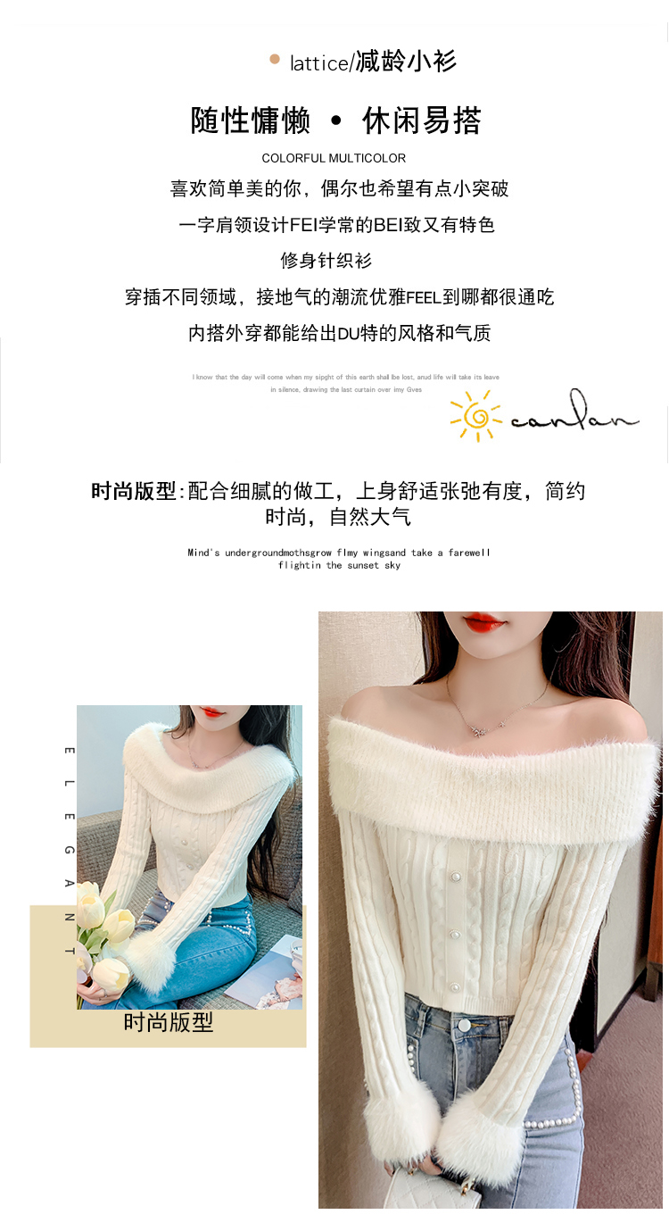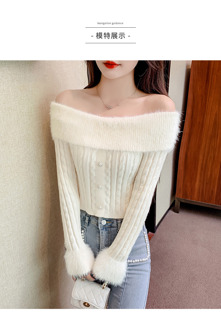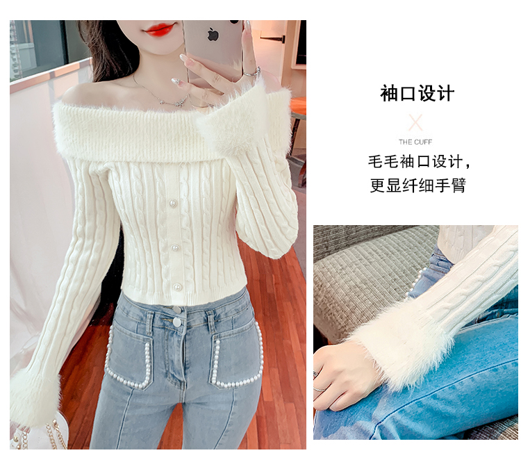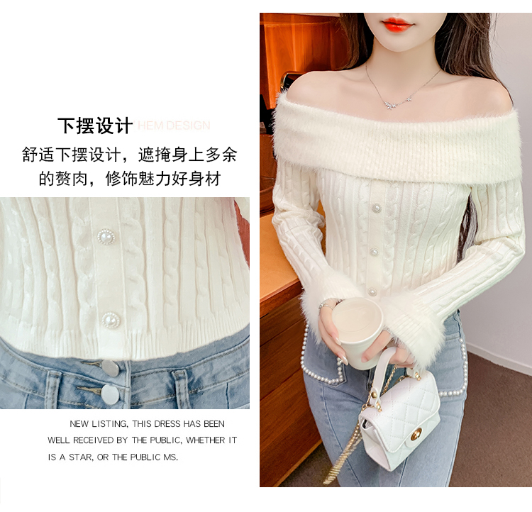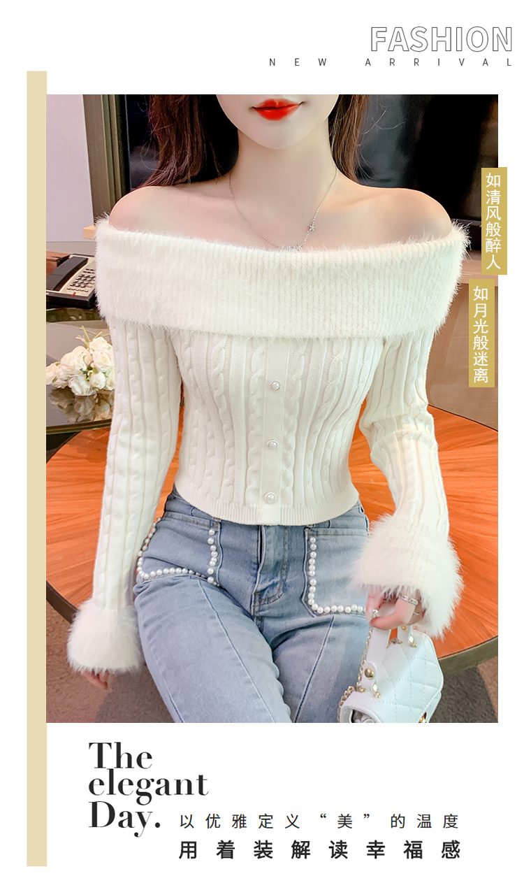 RM29824#新款法式甜美纯欲风毛绒一字肩设计修身针织杉