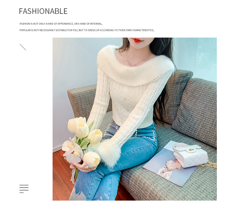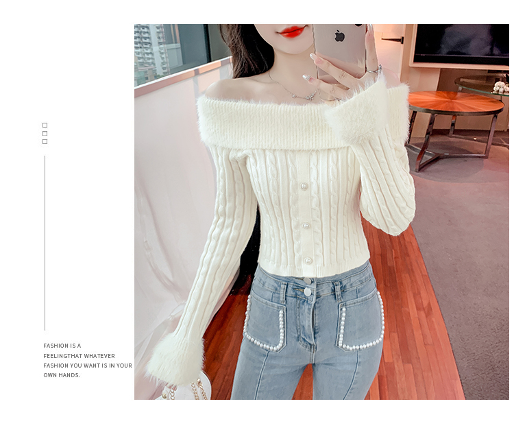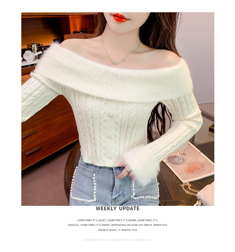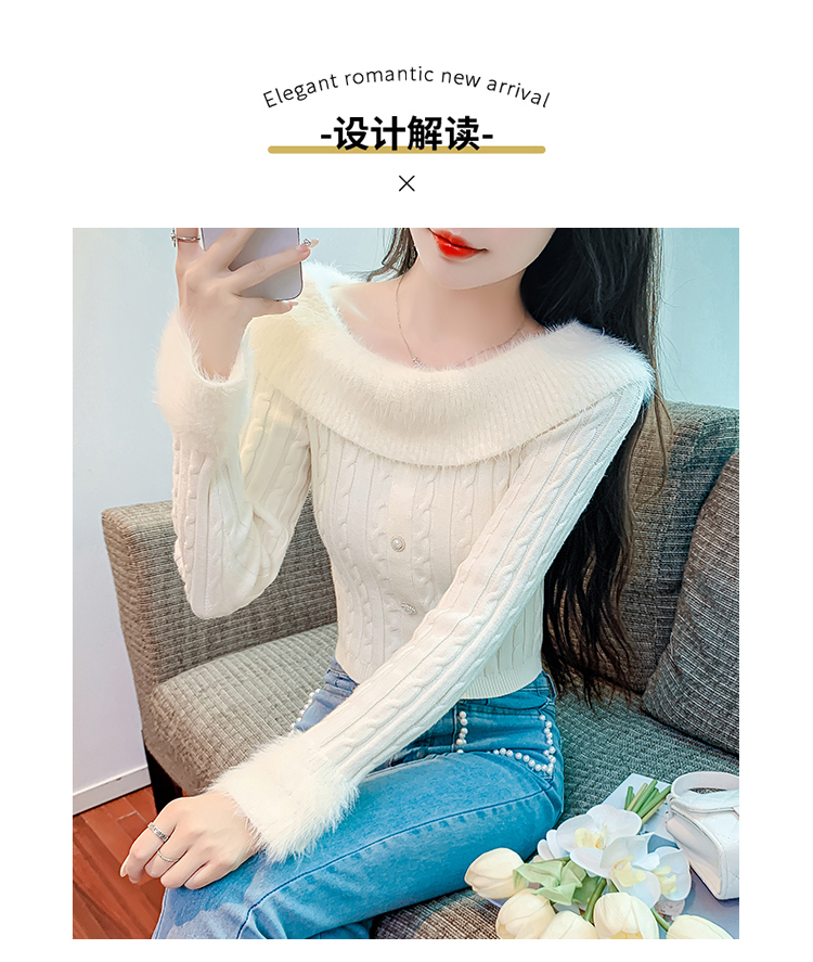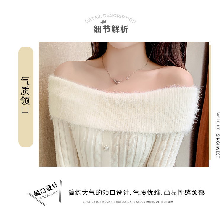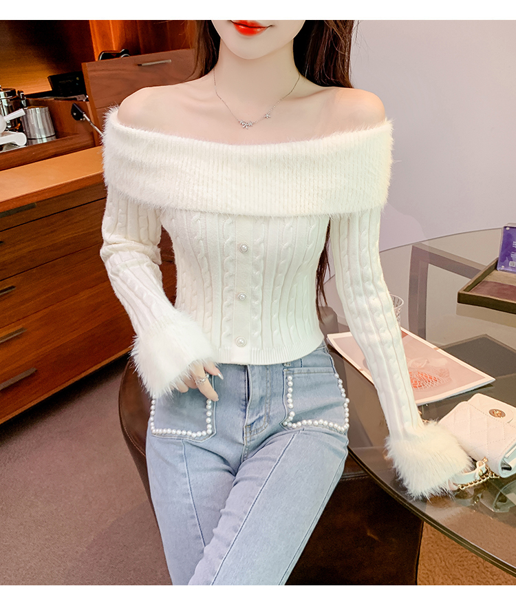 RM29824#新款法式甜美纯欲风毛绒一字肩设计修身针织杉