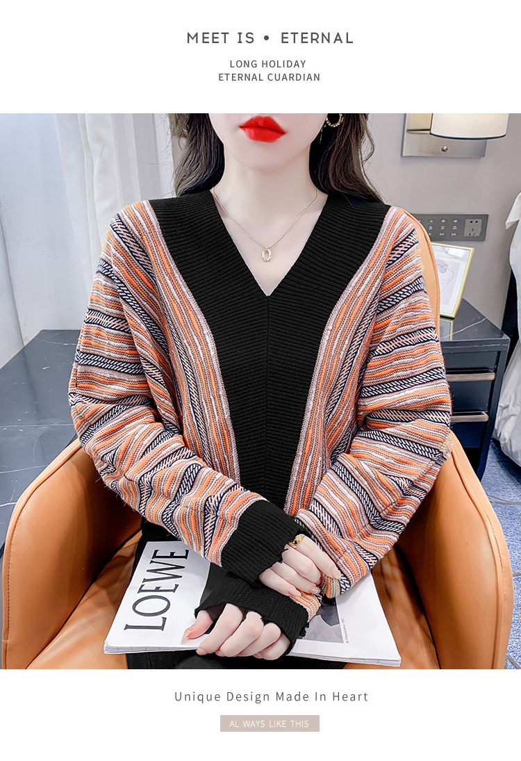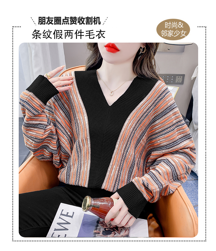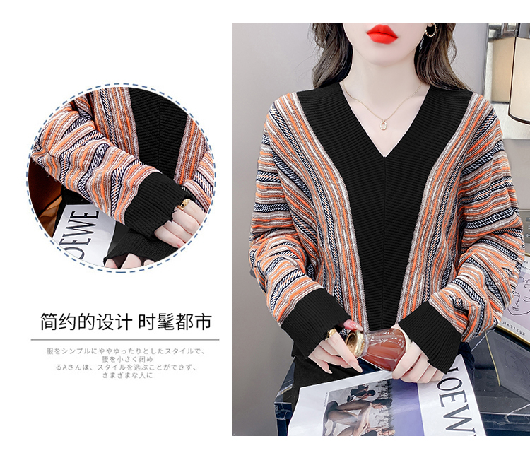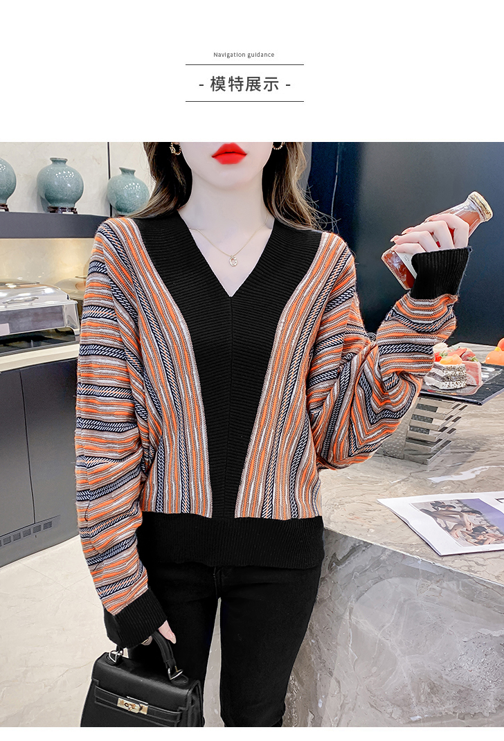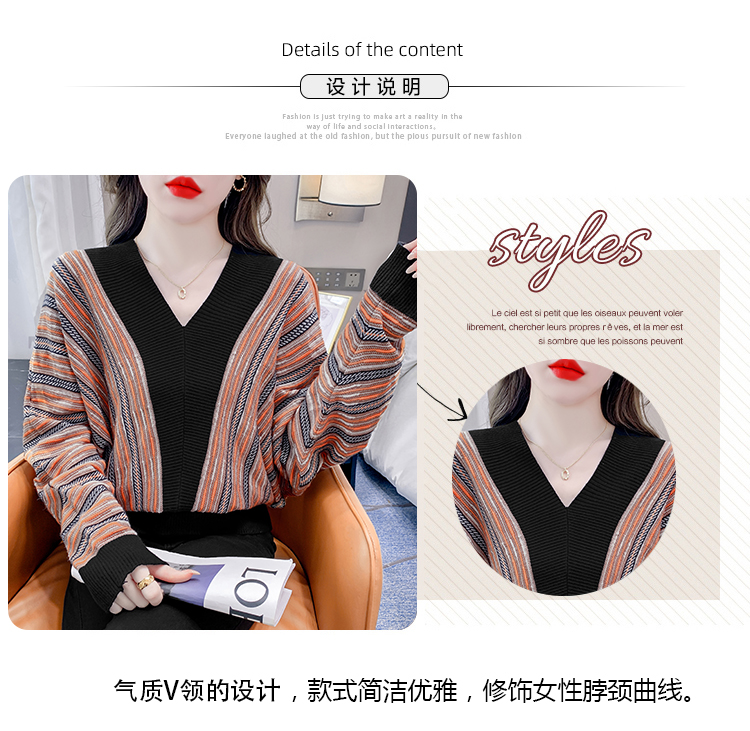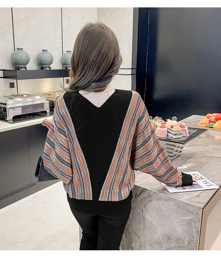 RM29825#新款V领针织衫蝙蝠袖撞色慵懒风毛衣打底衫女