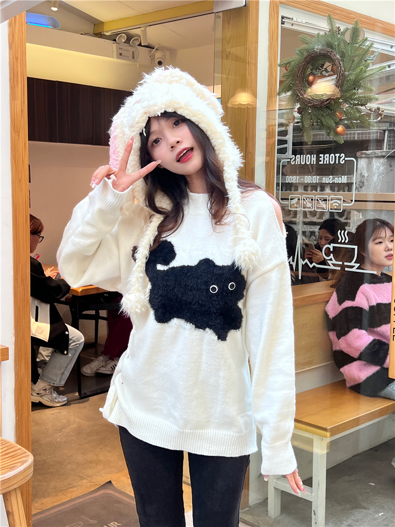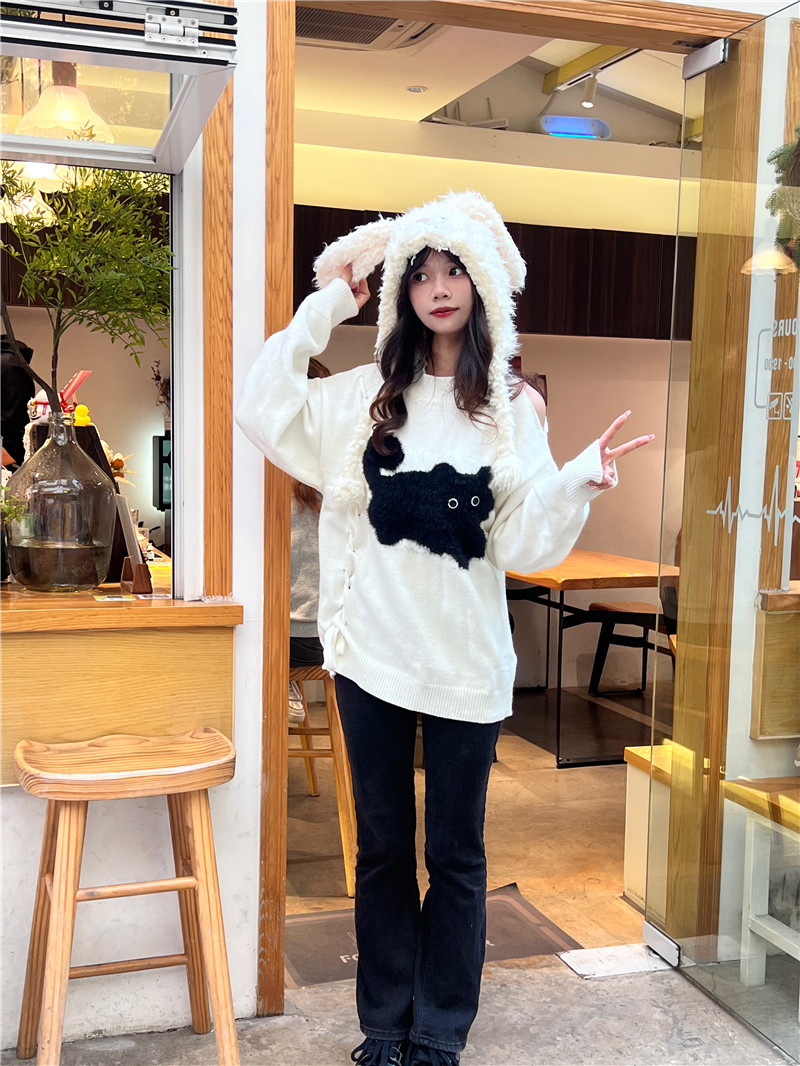 RM29829#新款慵懒风小黑猫露肩设计感毛衣外套女
