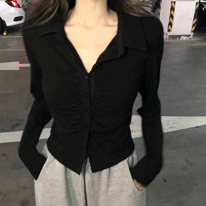 RM29911#新款复古翻领褶皱收腰显瘦百搭秋款纯欲开衫辣妹上衣