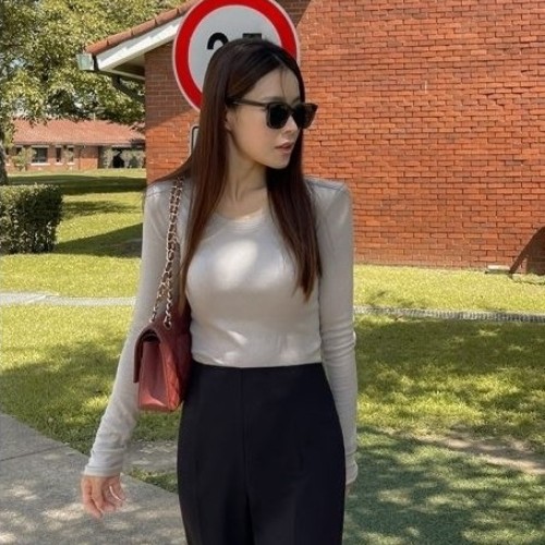 RM29937#韩国东大门春秋新款纯色百搭简约高腰短款打底上衣垫肩长袖T恤女
