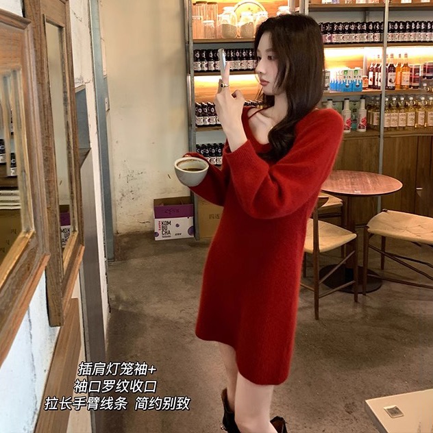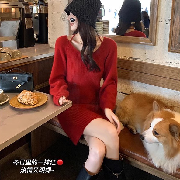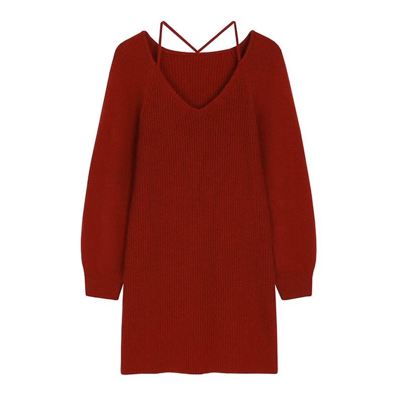 RM30018#热红酒 气质慵懒风V领细肩带灯笼袖红色针织连衣裙女冬季