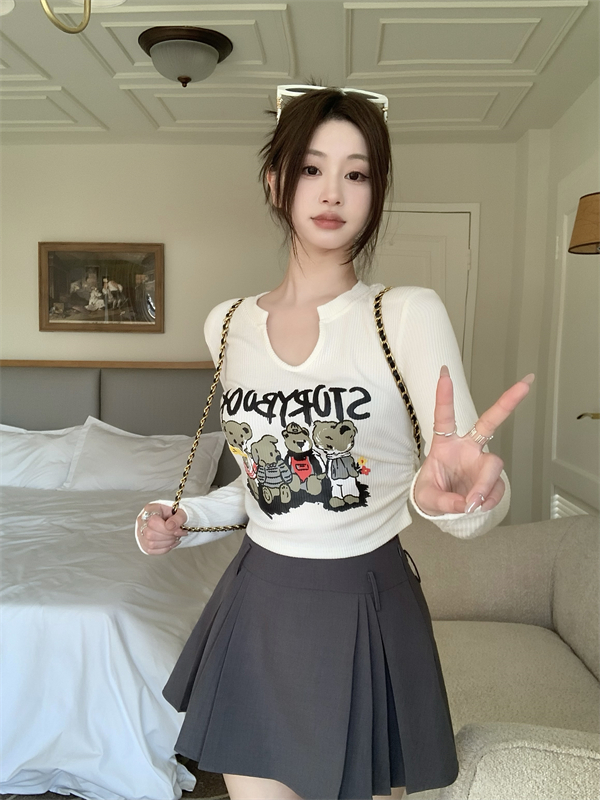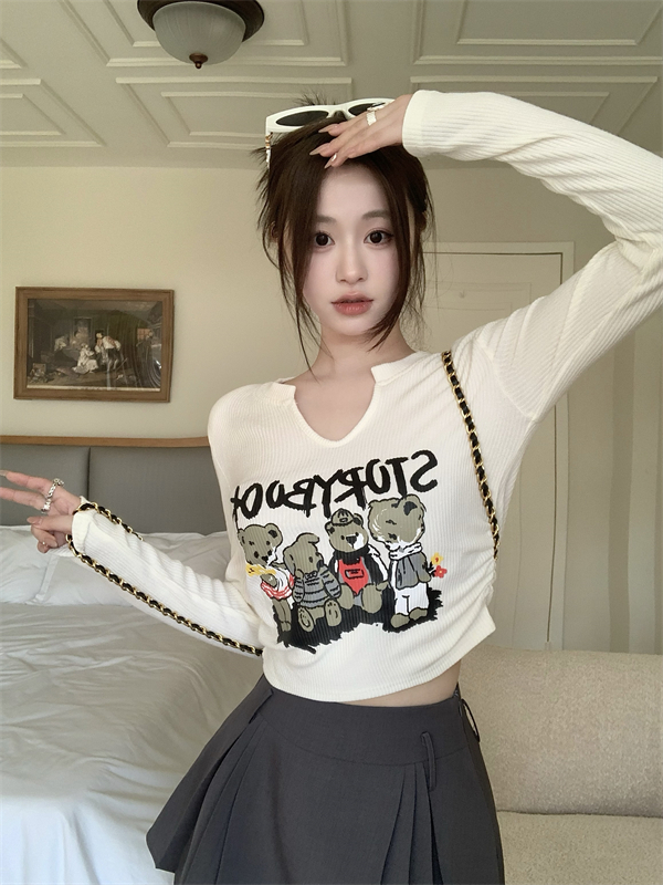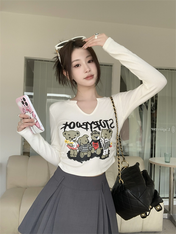 RM30063#卡通印花V领长袖T恤女装2023新款秋冬内搭打底衫短款上衣