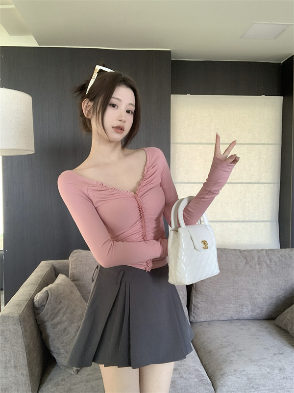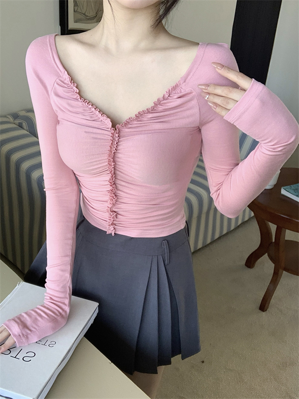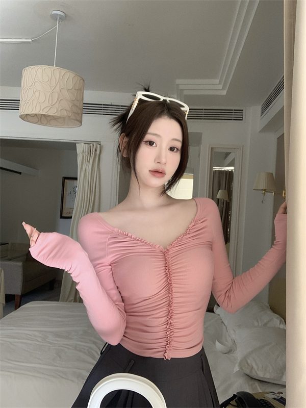 RM30067#偷心拉宠设计感兄长收腰显瘦V领褶皱针织T恤打底衫内搭
