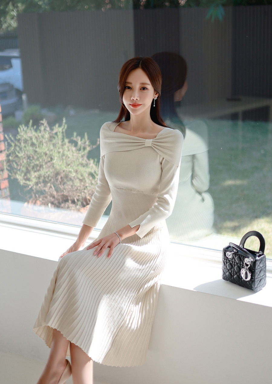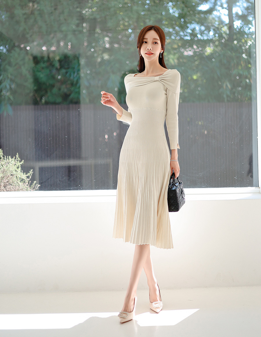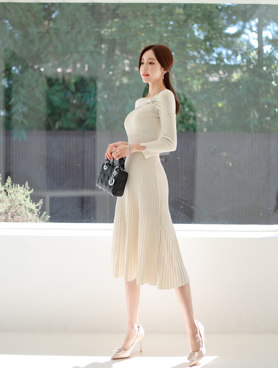 RM30115#新款包芯纱低圆领长袖修身针织连衣裙女荷叶边中裙