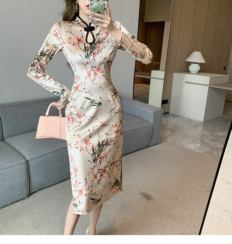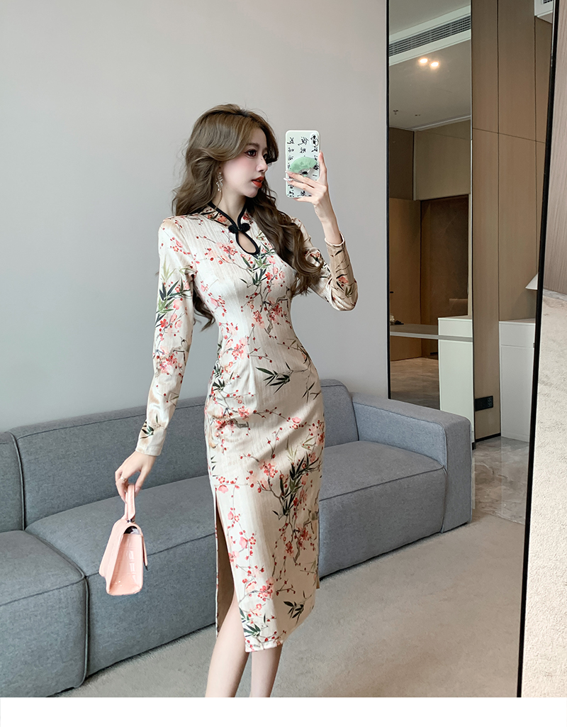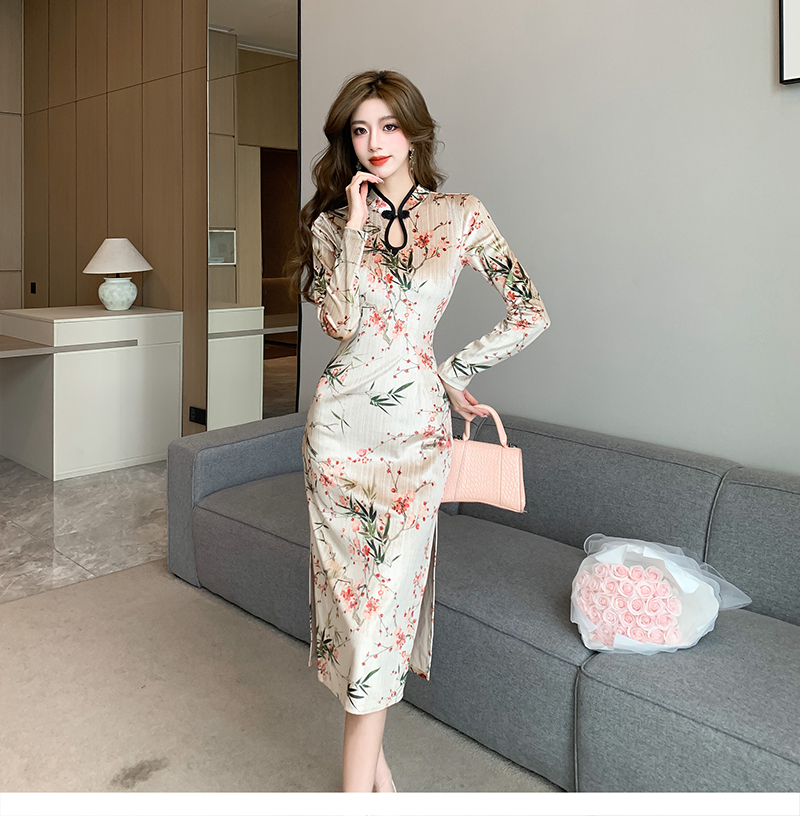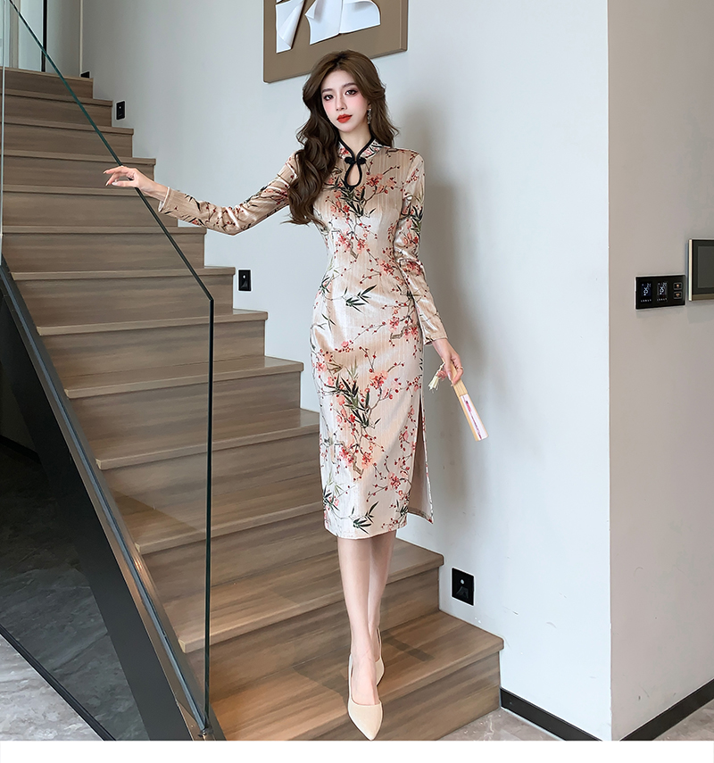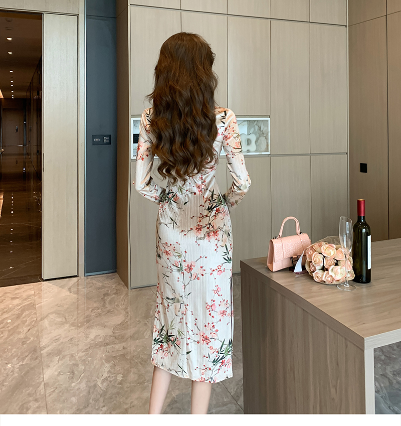 RM30168#高级感名媛长袖旗袍高腰显瘦高档丝绒印花开叉连衣裙