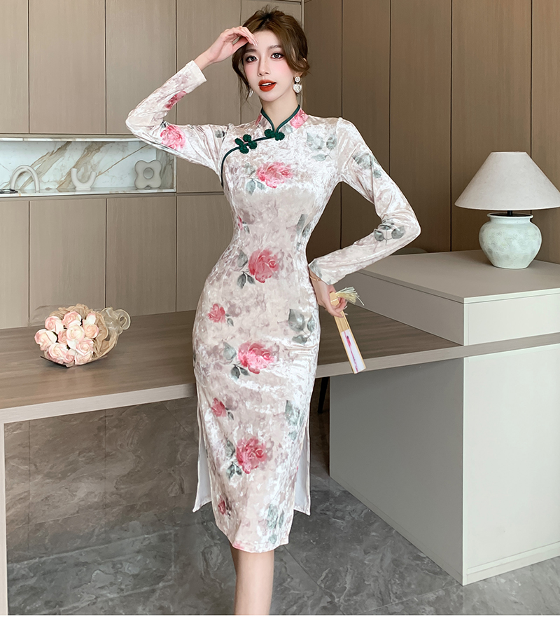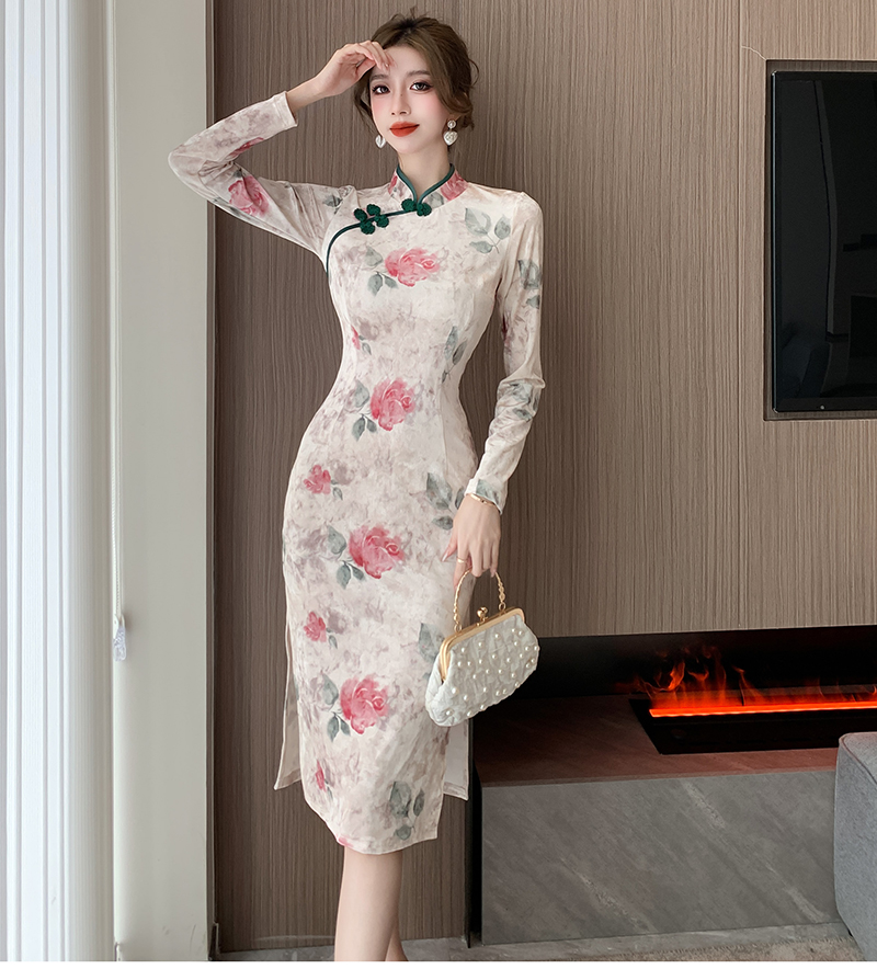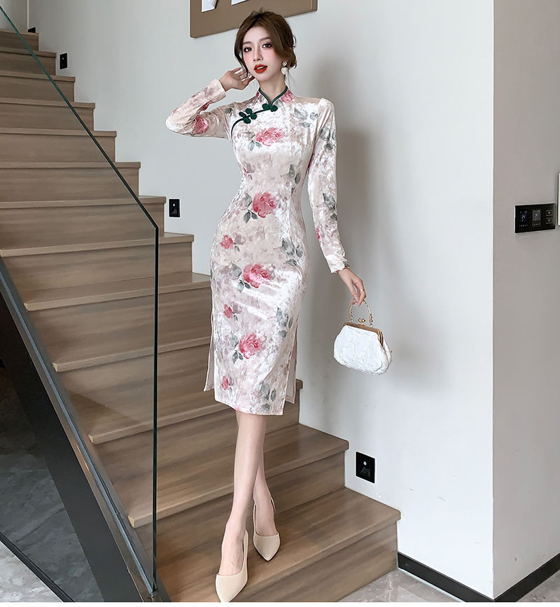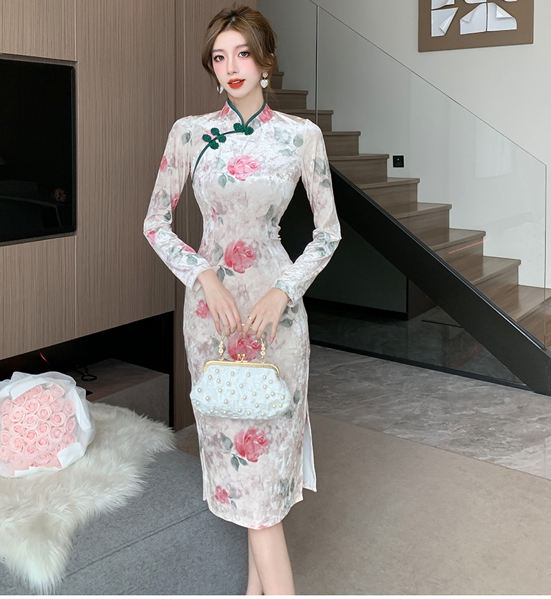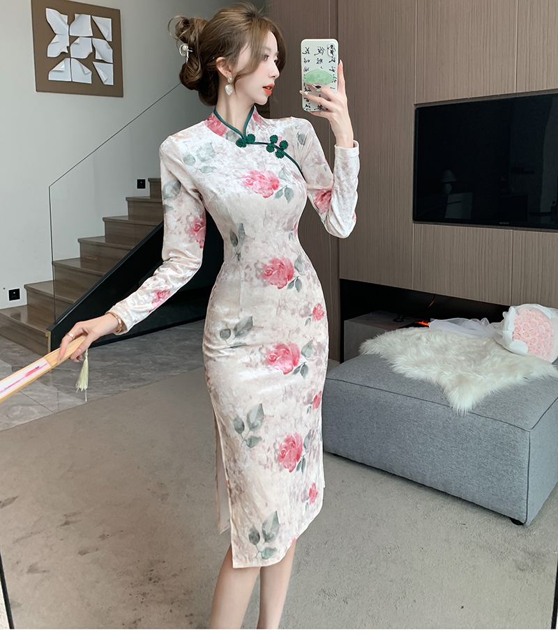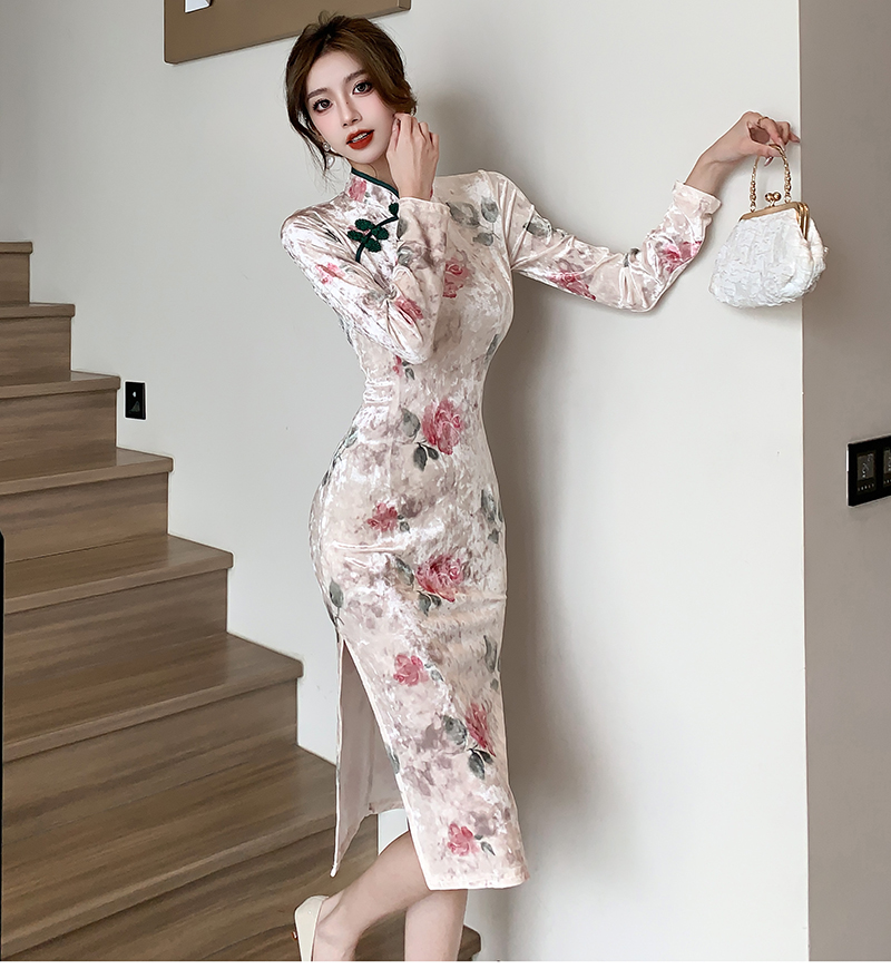 RM30169#新款改良中国风高级感显瘦气质丝绒压花开叉旗袍连衣裙