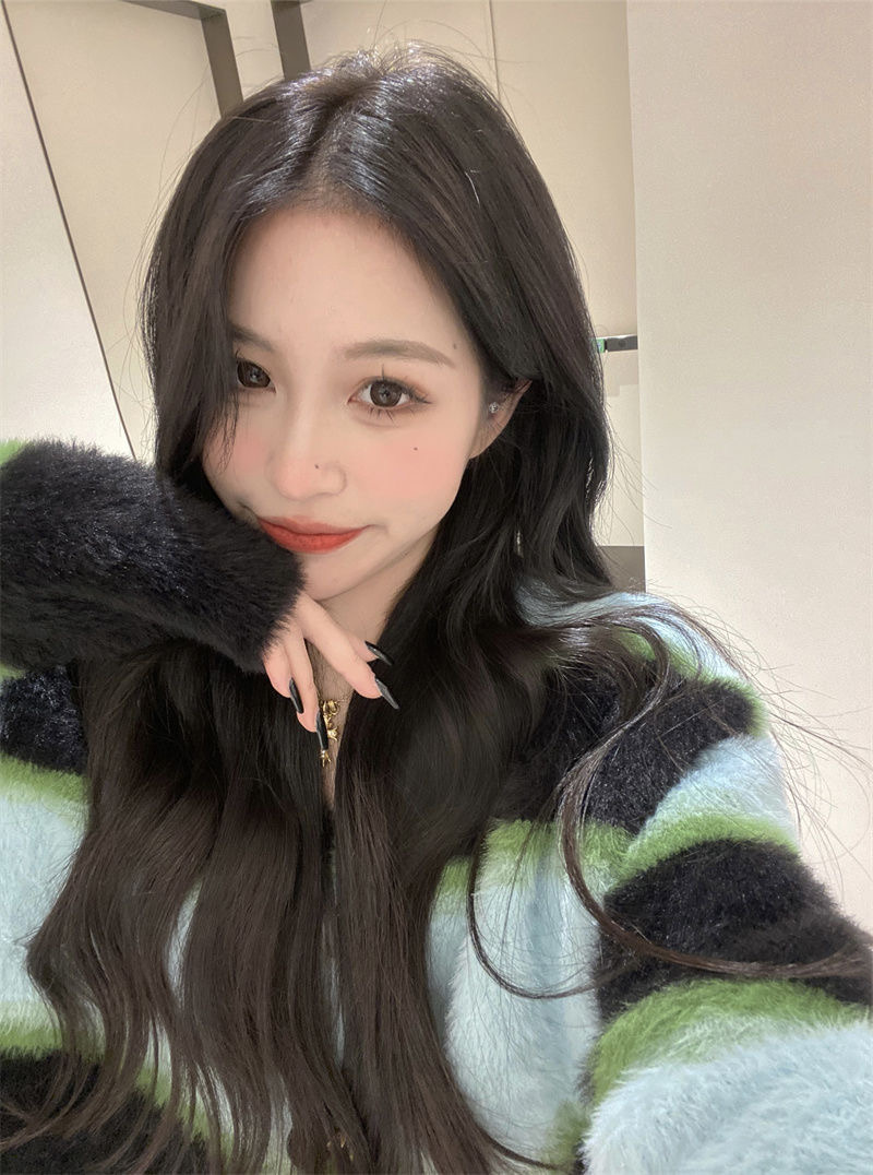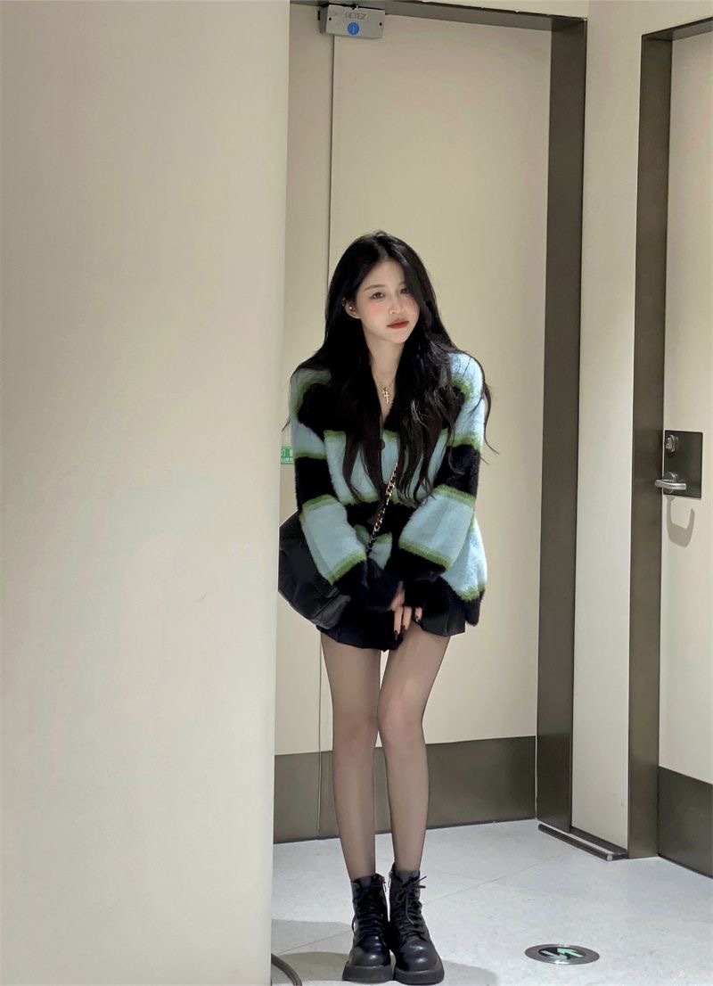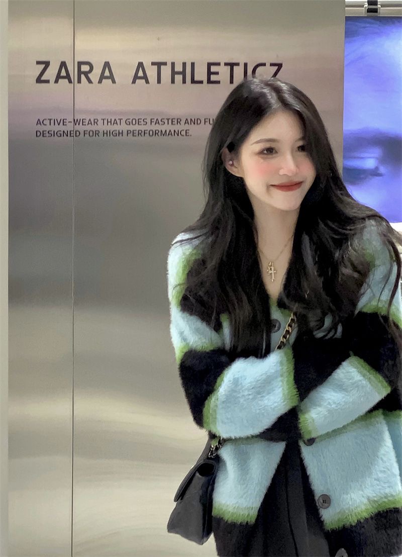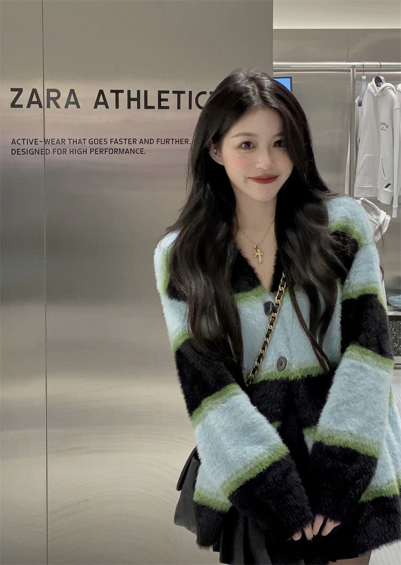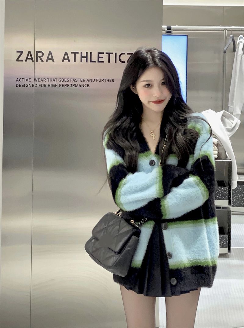 RM30235#V领格子毛衣外套女冬季2023新款毛茸茸加厚宽松撞色长袖针织上衣