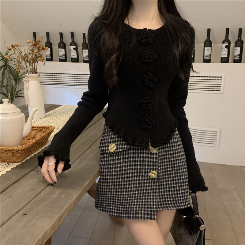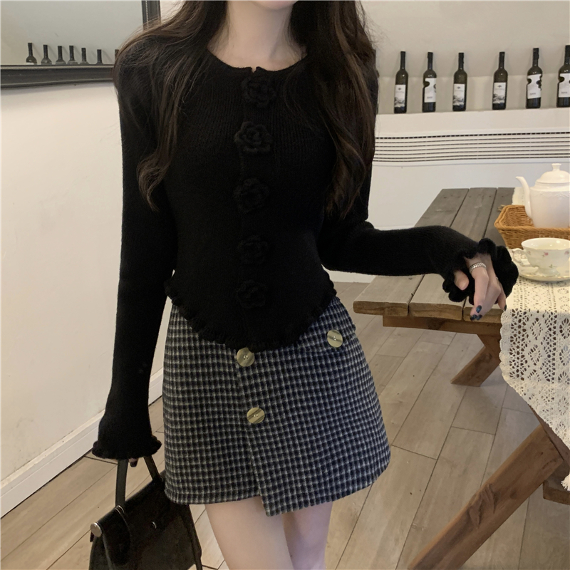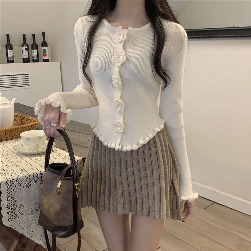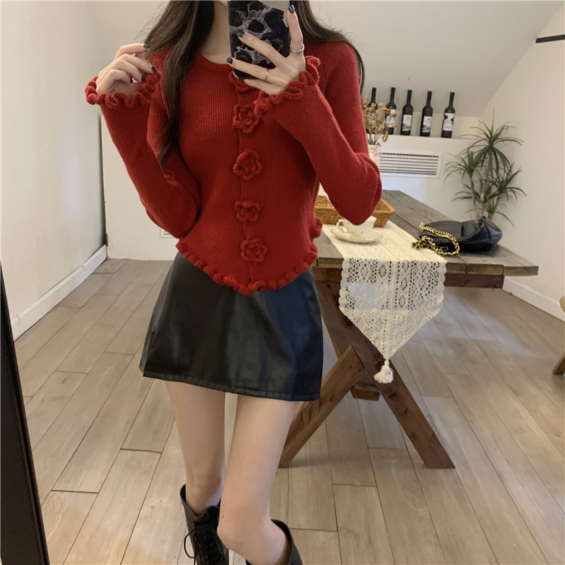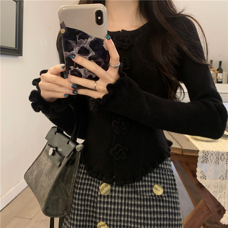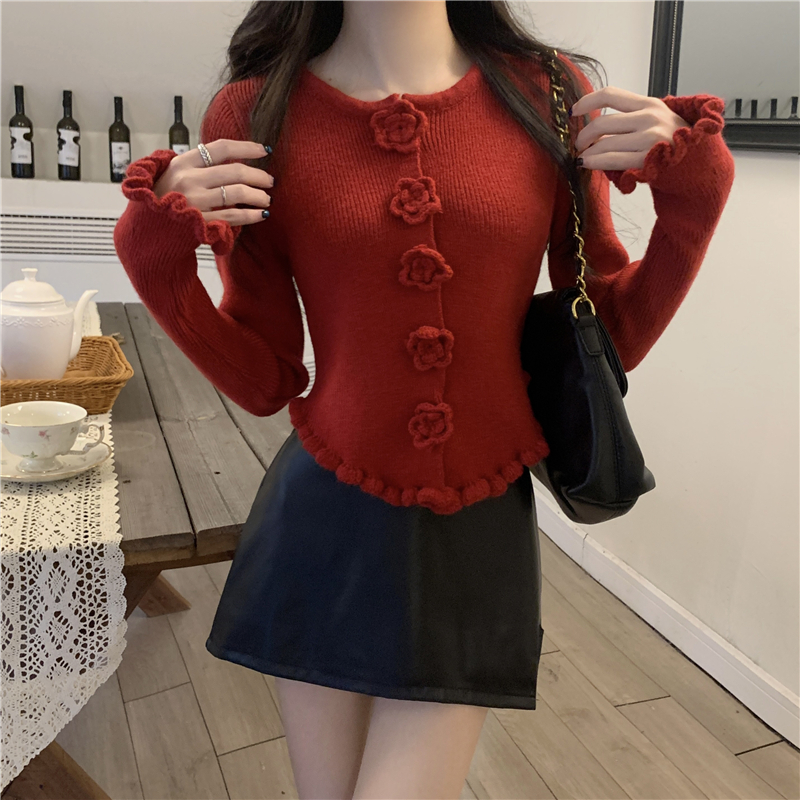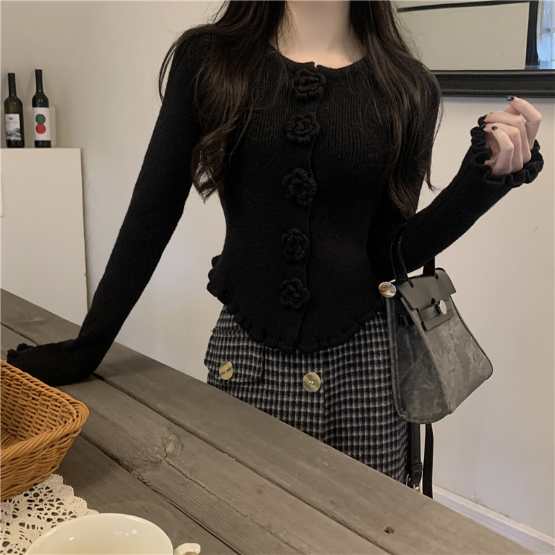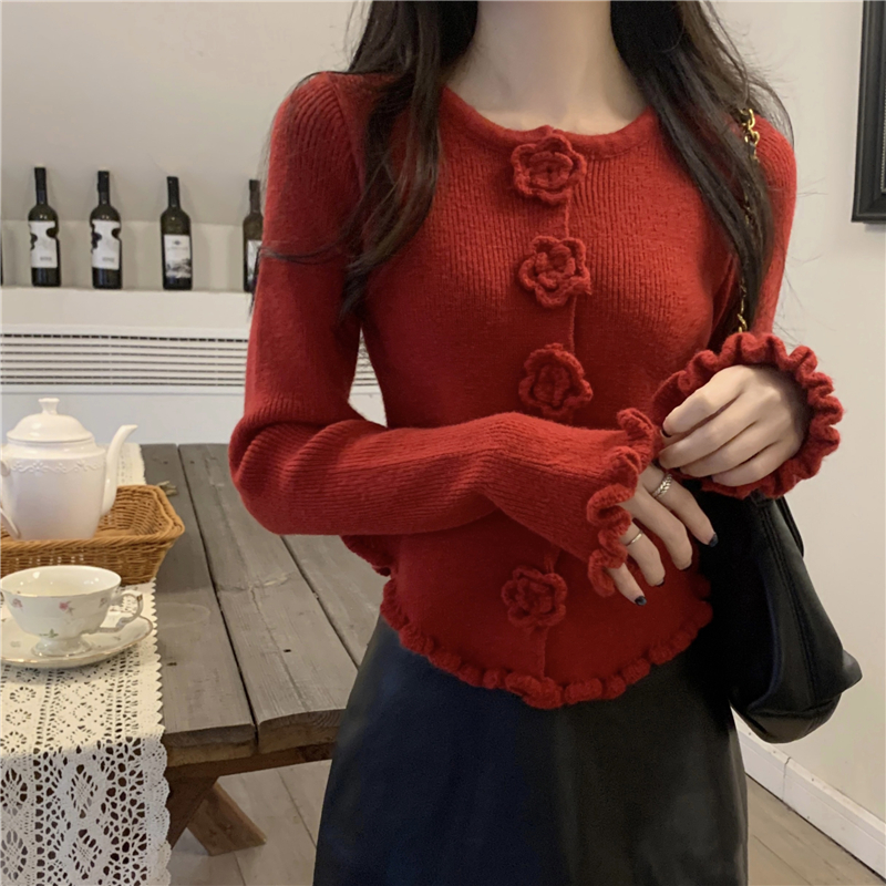 RM30465#新款花朵木耳边毛衣修身针织开衫女