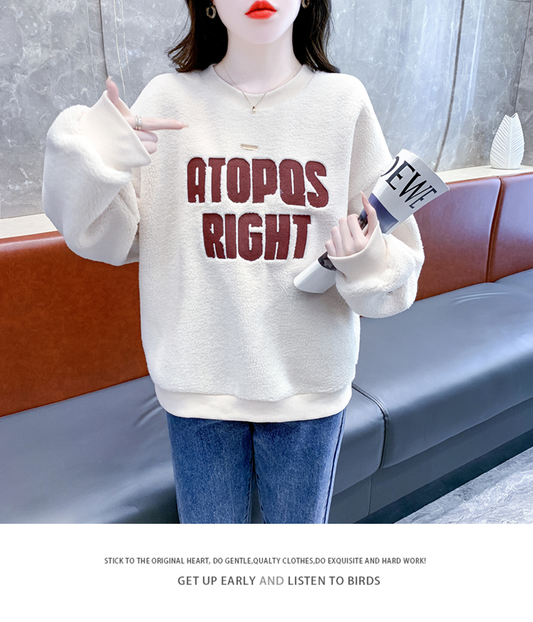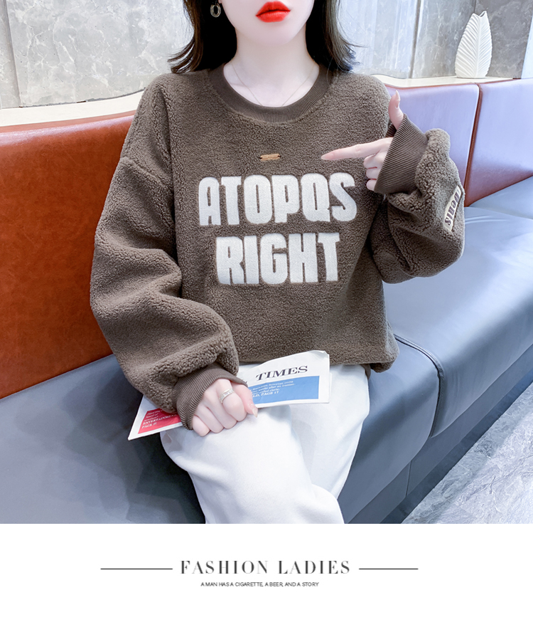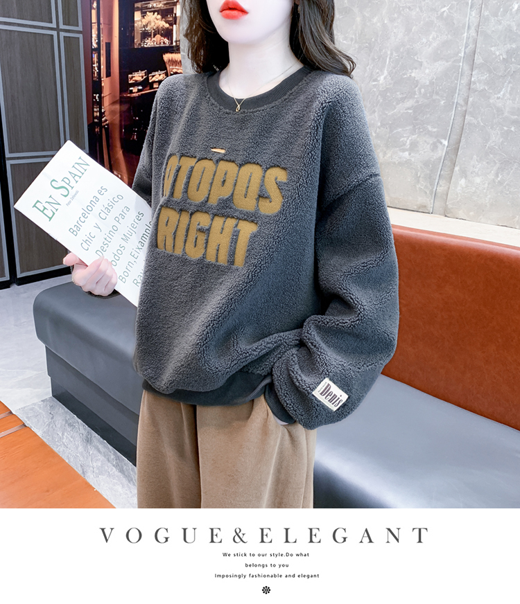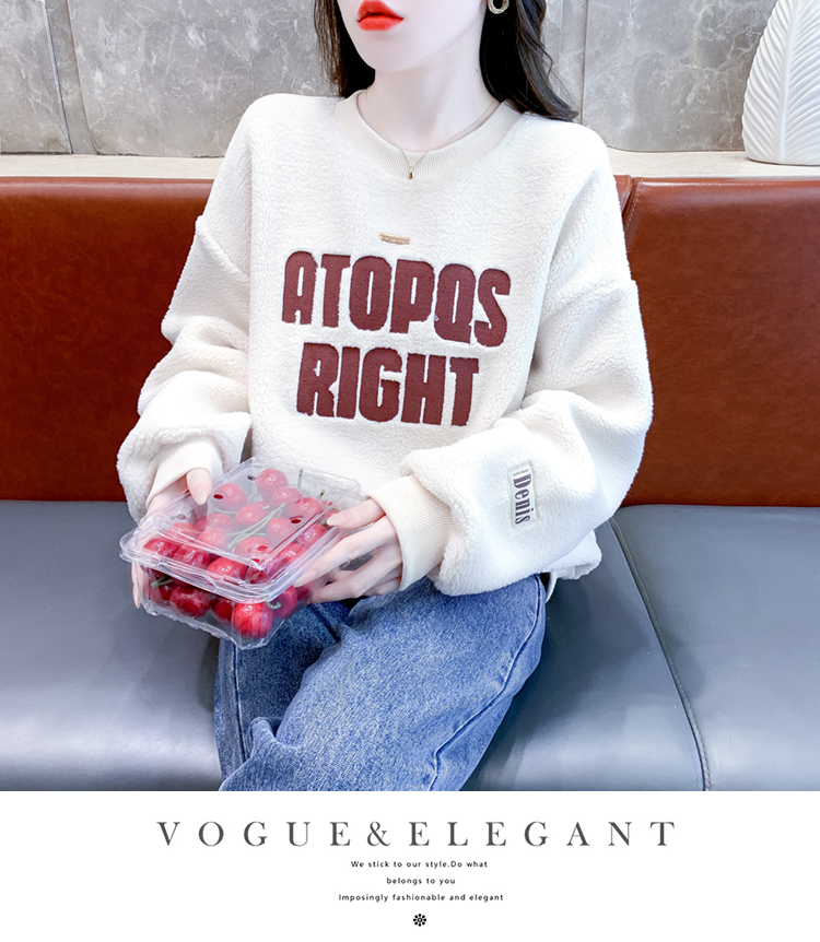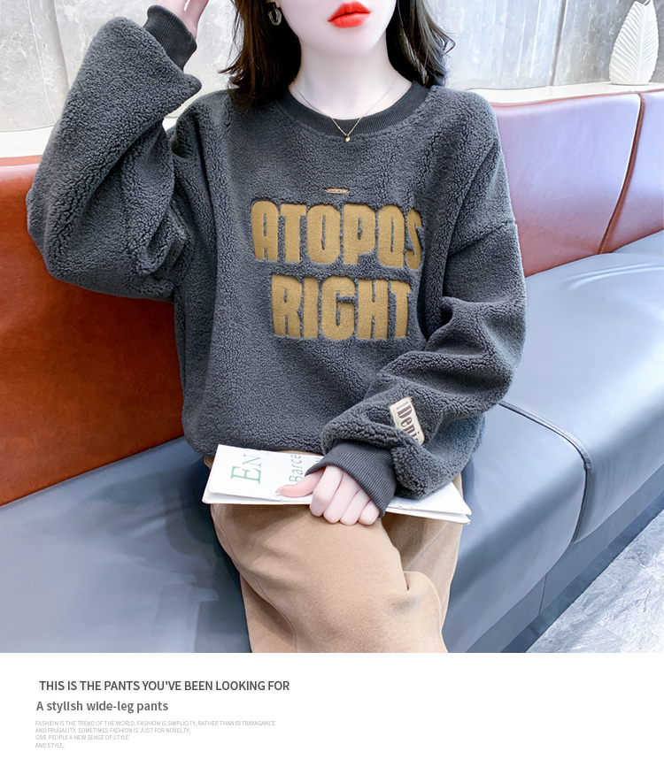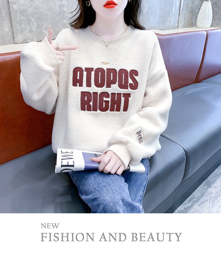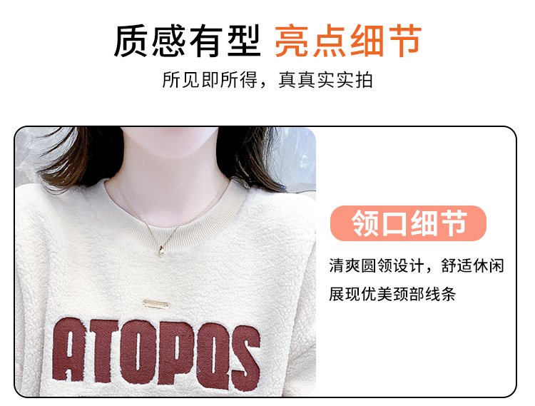 RM30481#设计感撞色字母圆领卫衣女2023冬新小个子宽松加厚羊羔绒上衣