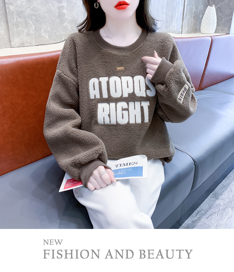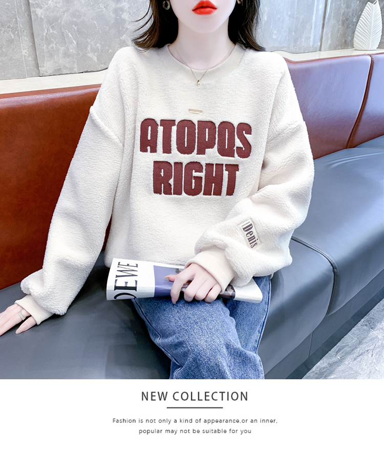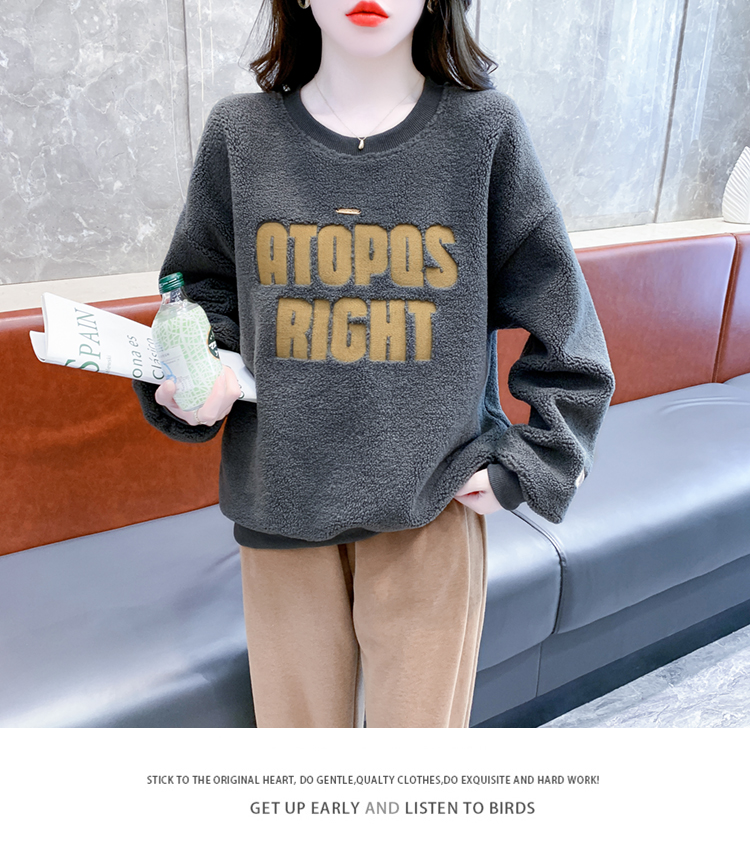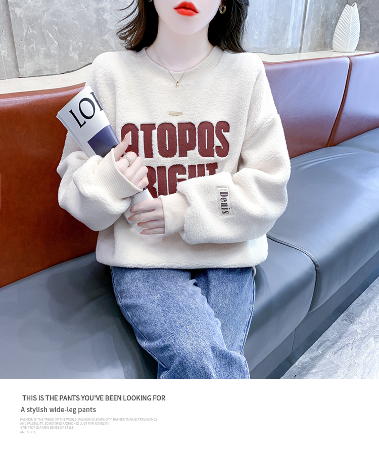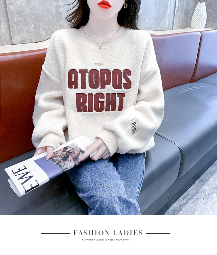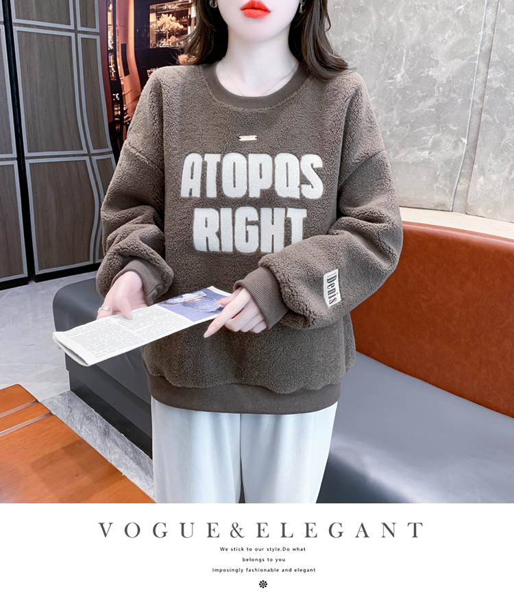RM30481#设计感撞色字母圆领卫衣女2023冬新小个子宽松加厚羊羔绒上衣